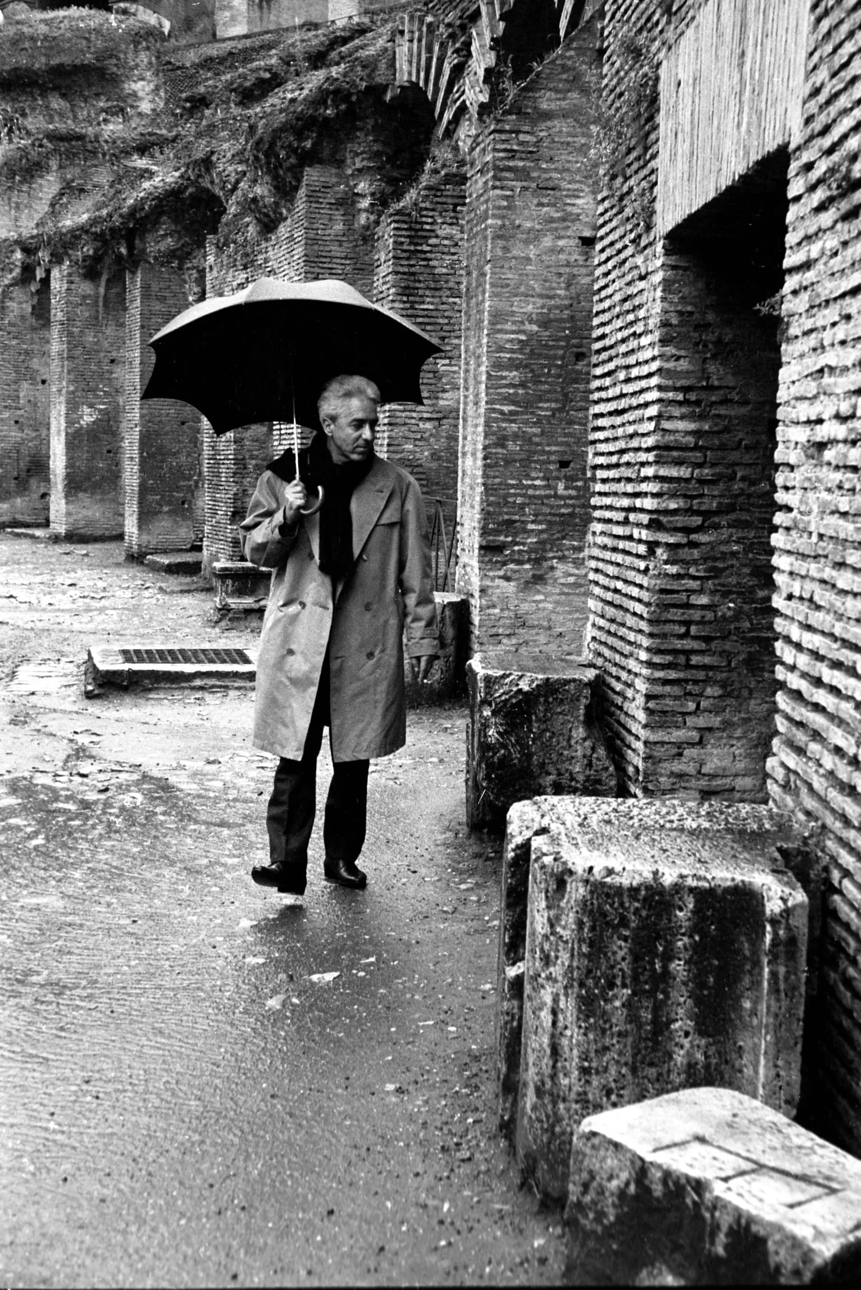 Black and white photograph of a man in a trench coat walking with a dark umbrella along a rain-slicked path through ancient brick ruins