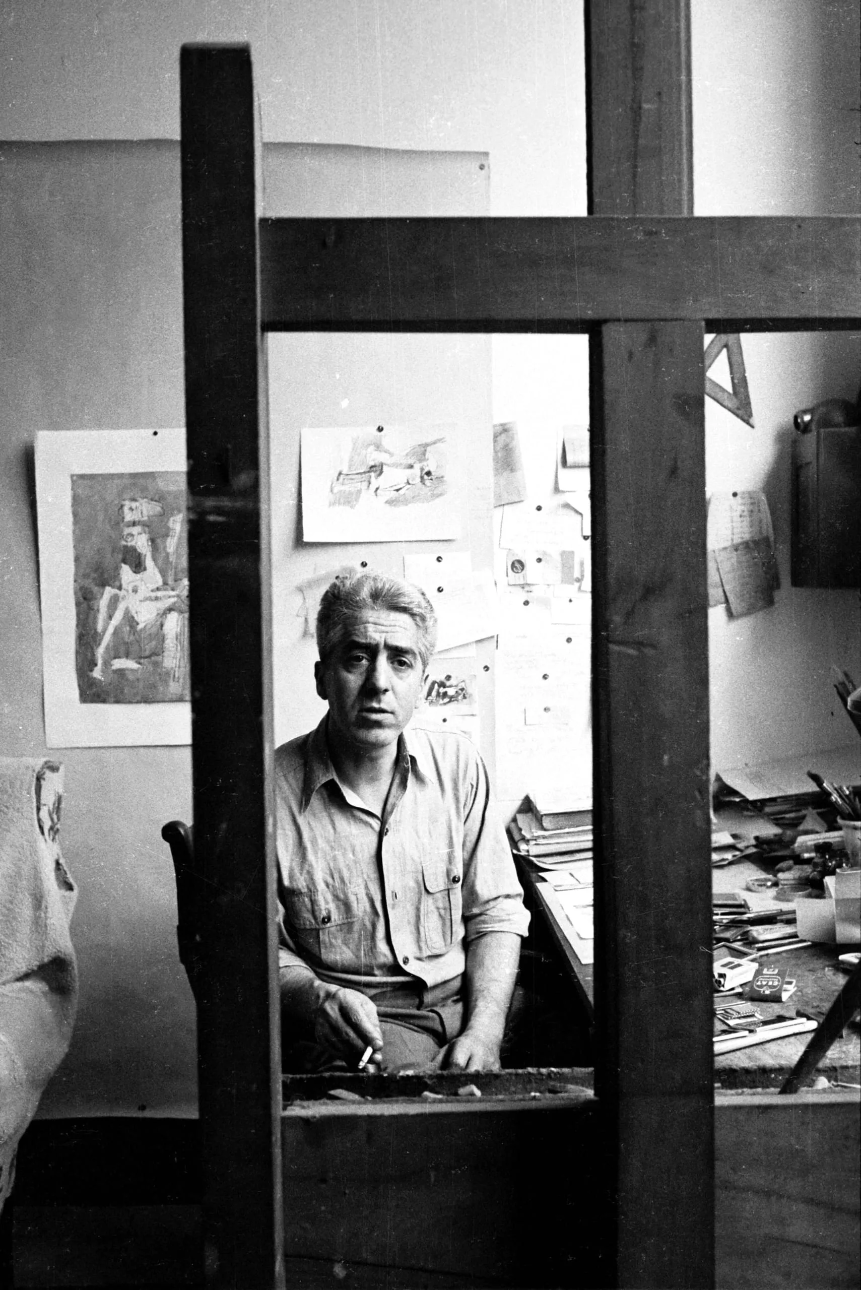 Black and white photograph of a man seated at a cluttered studio worktable, framed by a large wooden easel in the foreground, drawings pinned to the wall behind him
