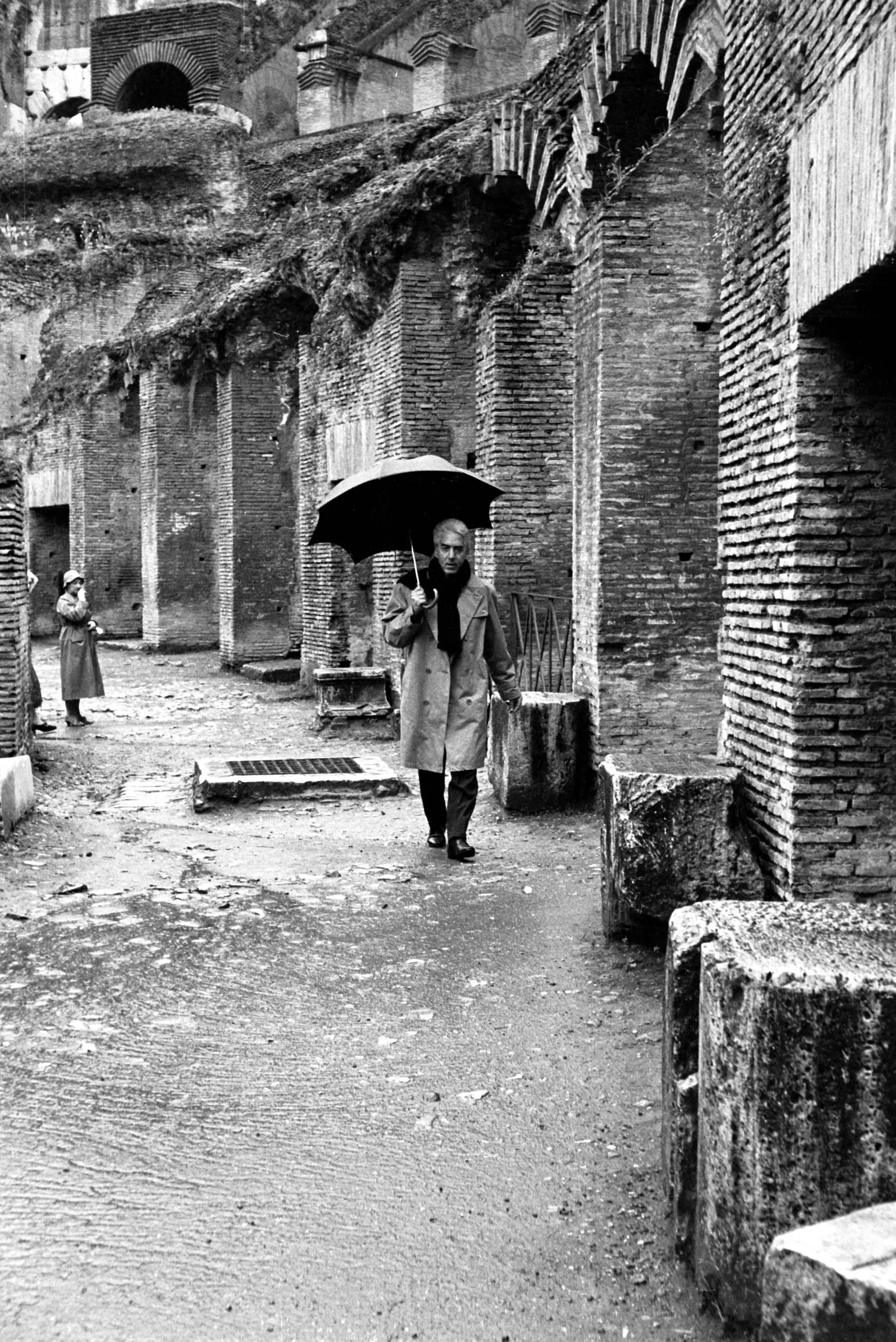 Black and white photograph of a man in a trench coat holding an open umbrella walking toward the camera through an ancient brick-arched corridor