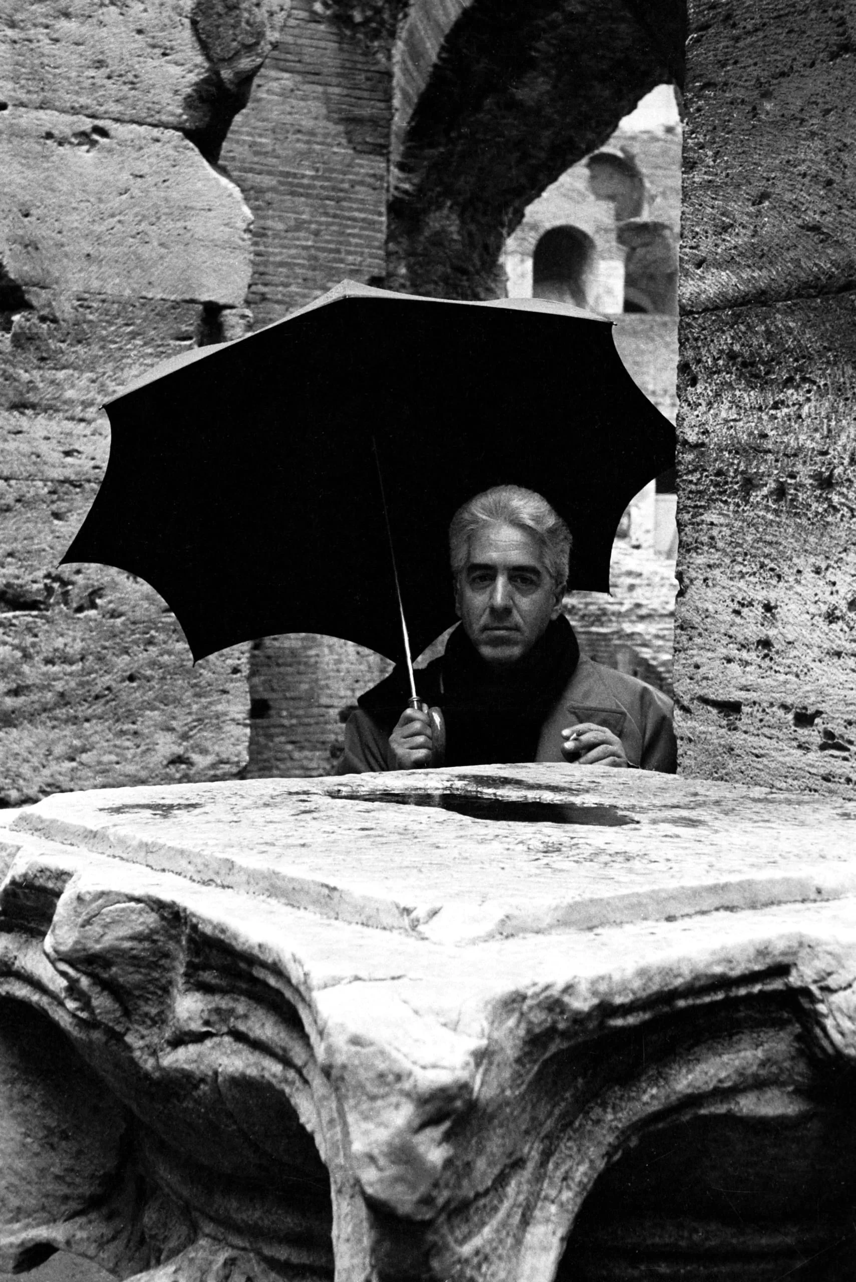 Black and white photograph, a man with gray hair stands behind a stone ruin fragment, holding an open black umbrella, ancient arched walls behind him