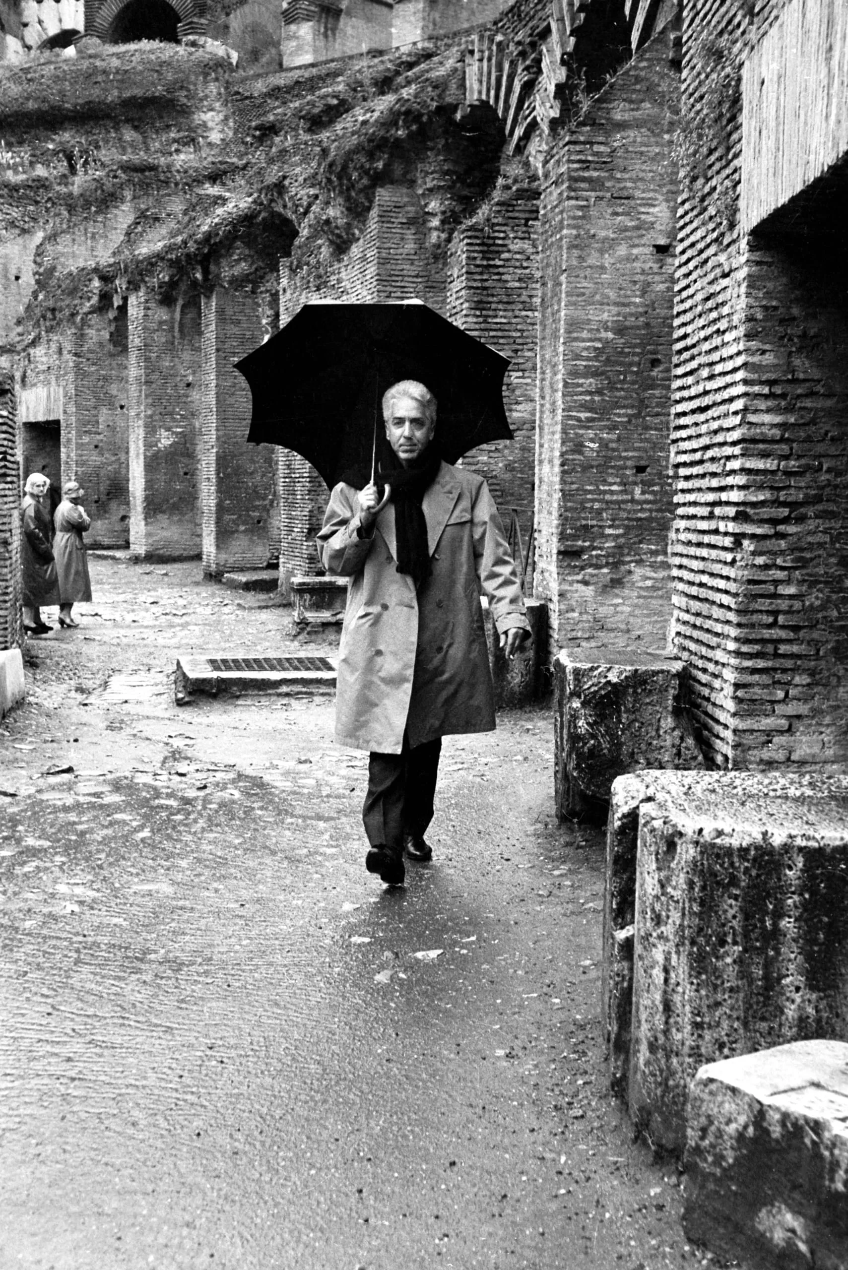 Black and white photograph, a man in a trench coat walks toward the camera under an open black umbrella in a rain-wet ancient brick passageway