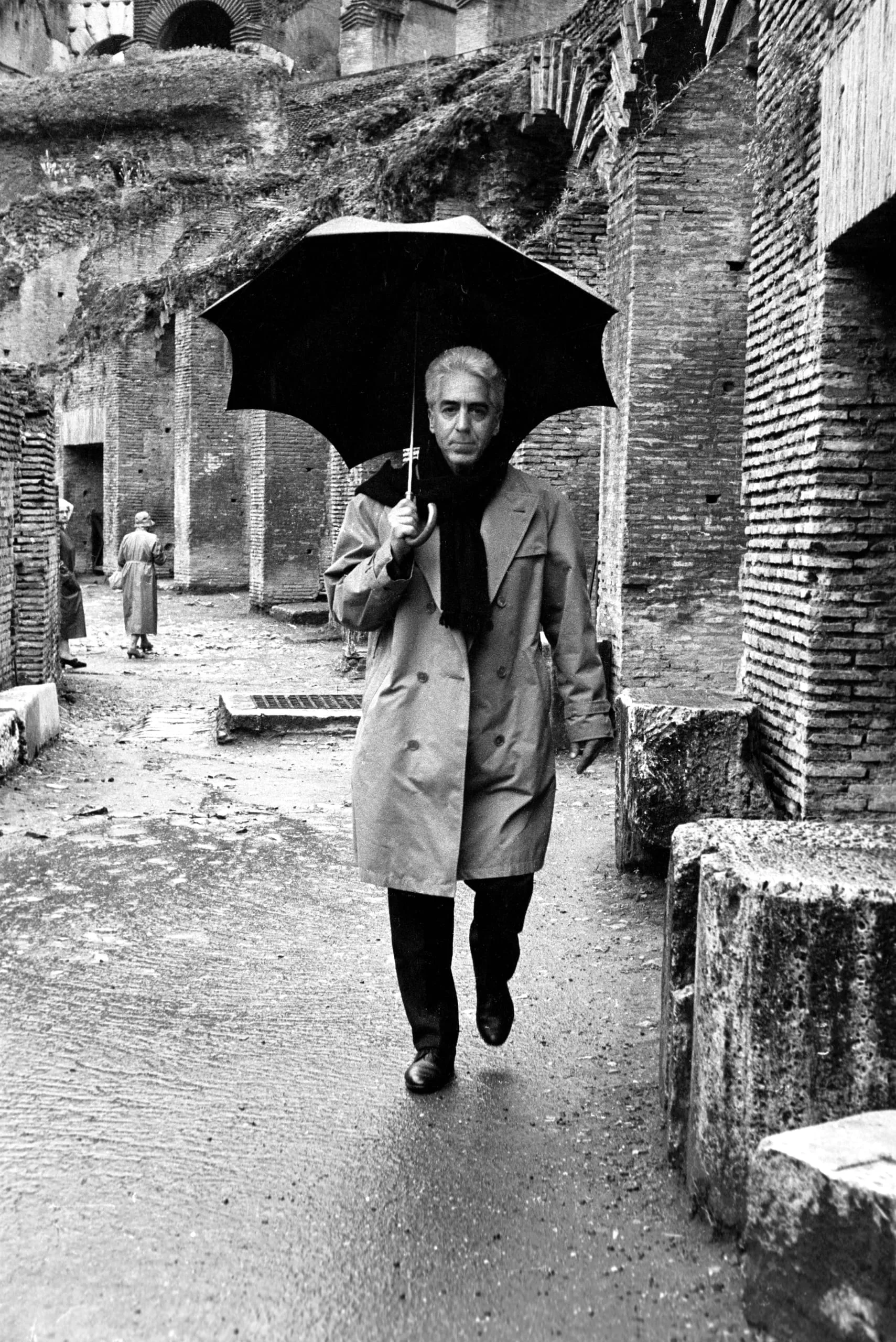 Black and white photograph of a man in a trench coat walking toward the camera under a black umbrella along a wet passageway lined with ancient brick arches