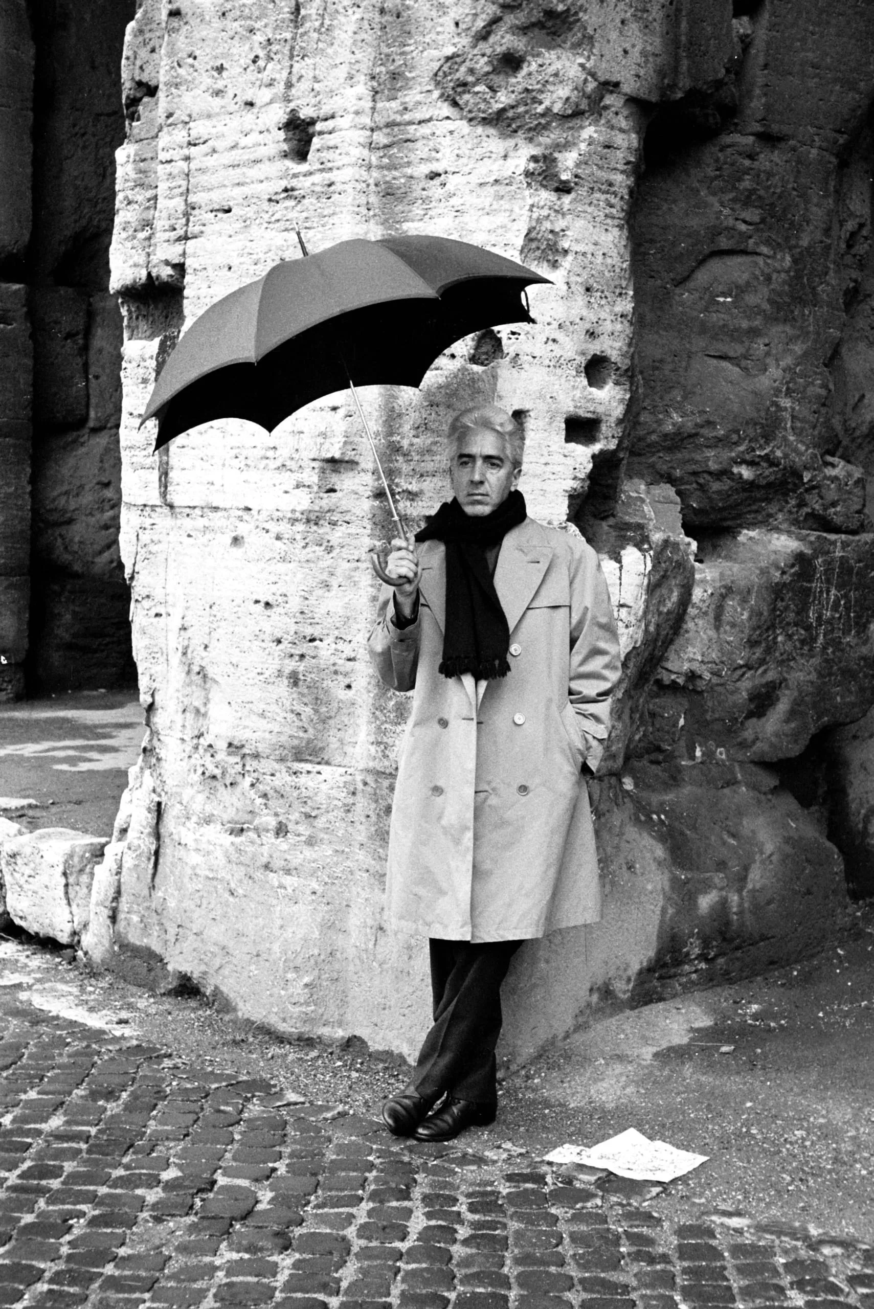 Black and white photograph of a man in a trench coat and scarf standing full-length against an ancient stone wall, holding an open umbrella