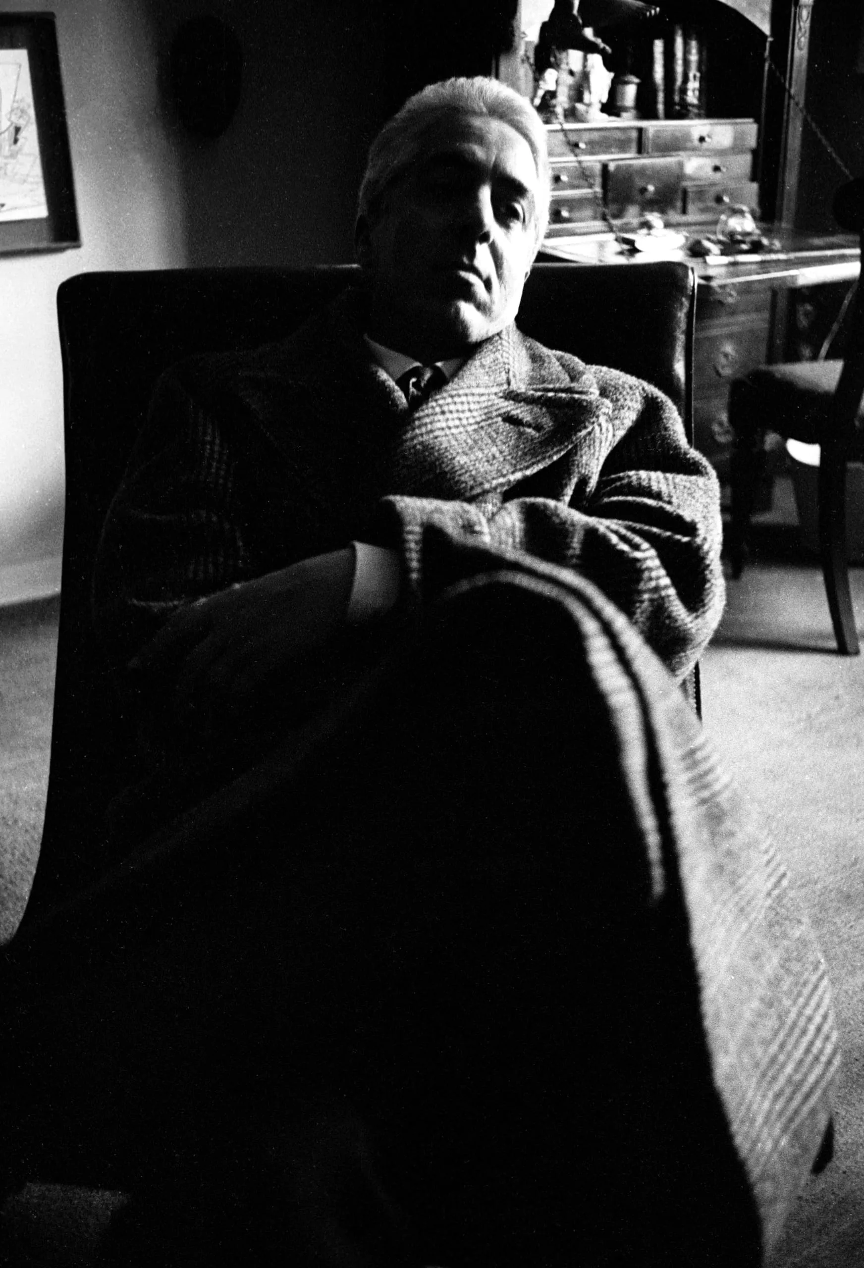 Black and white photograph, a white man with pale hair seated in a dark armchair, shot from a low angle with dramatic directional lighting, crossed legs extending toward the camera