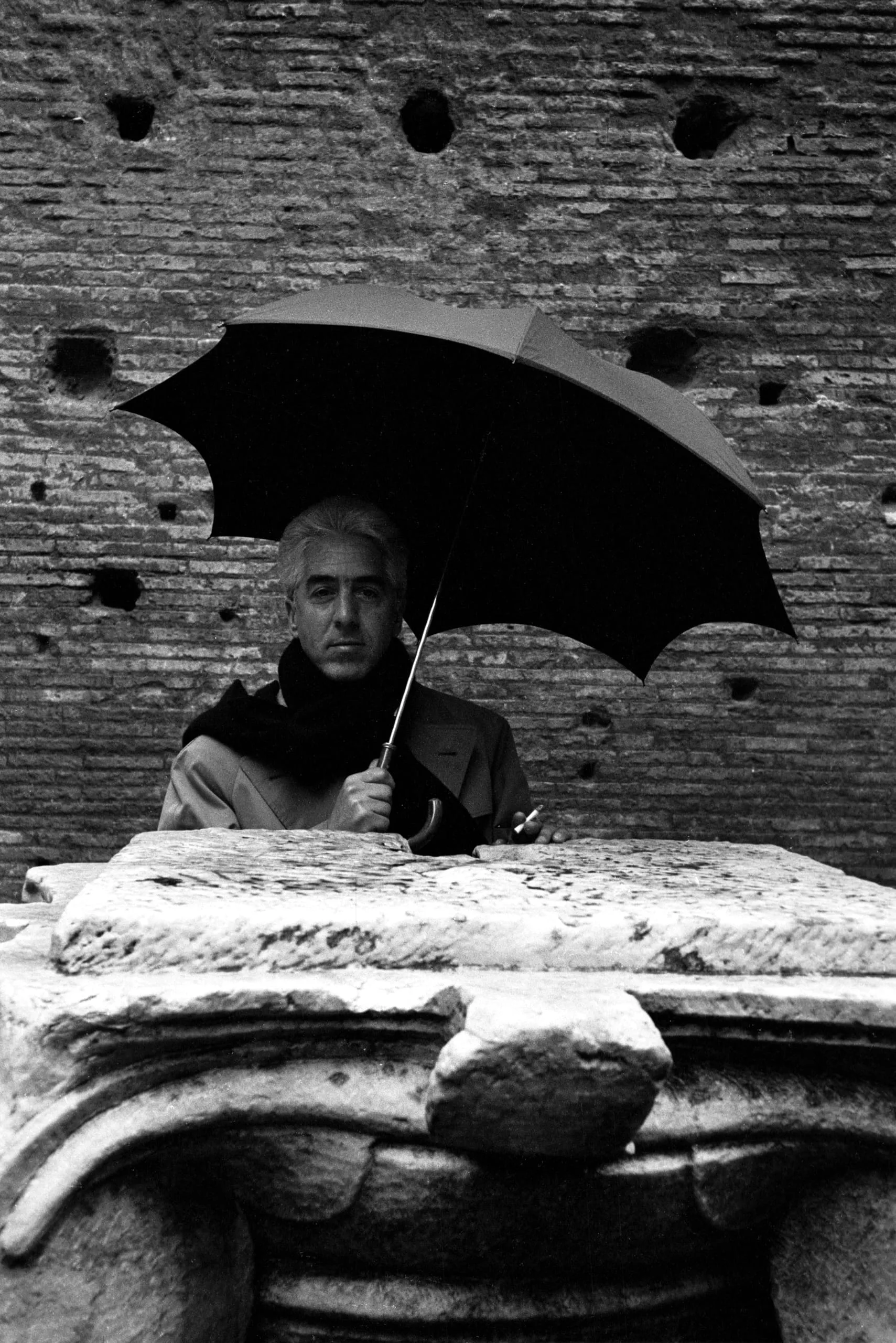 Black and white portrait photograph, a gray-haired man holding a large open umbrella, standing behind a carved stone fragment before an ancient brick wall