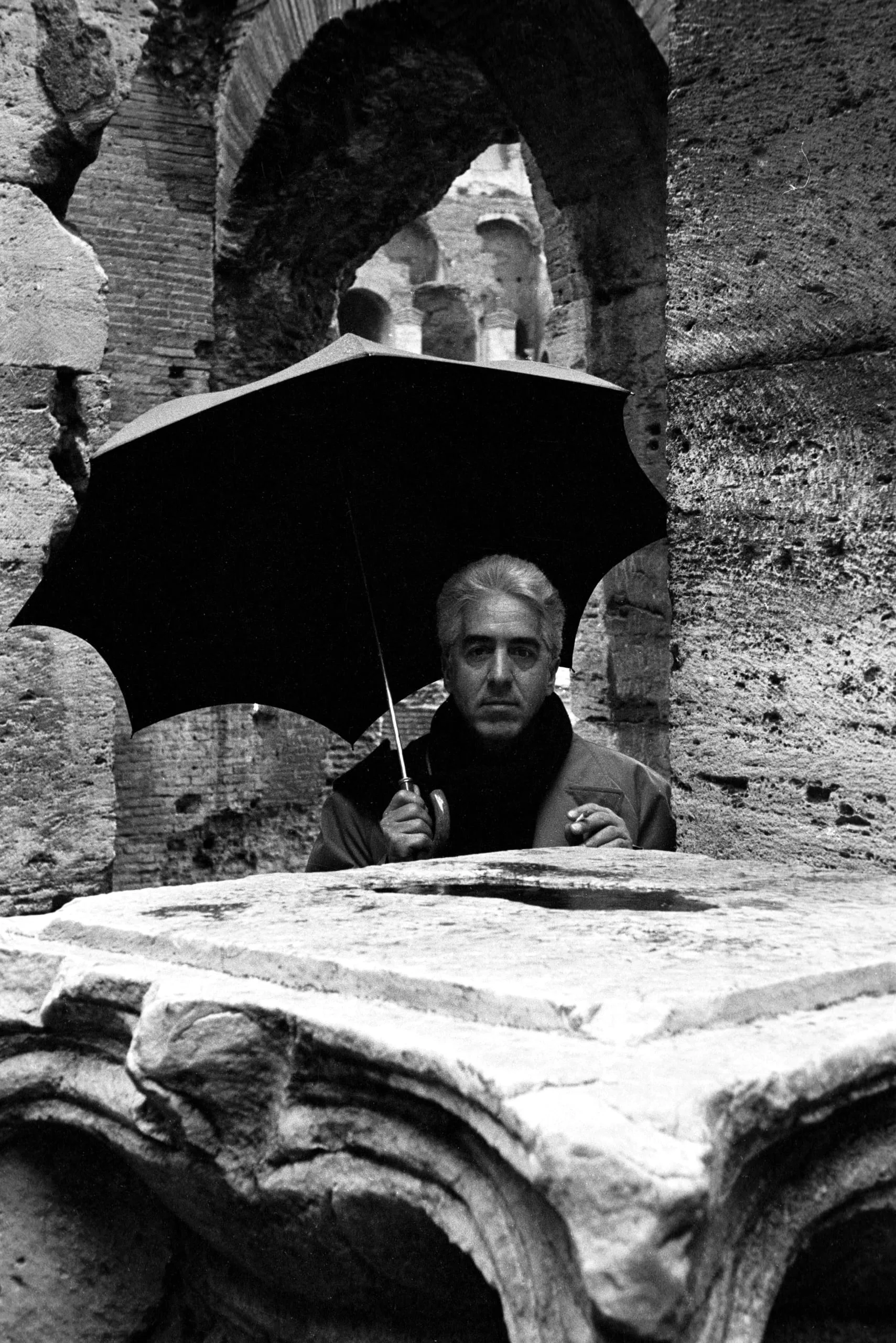 Black and white photograph of a man holding a dark umbrella, standing behind an aged stone block within a large arched ruin