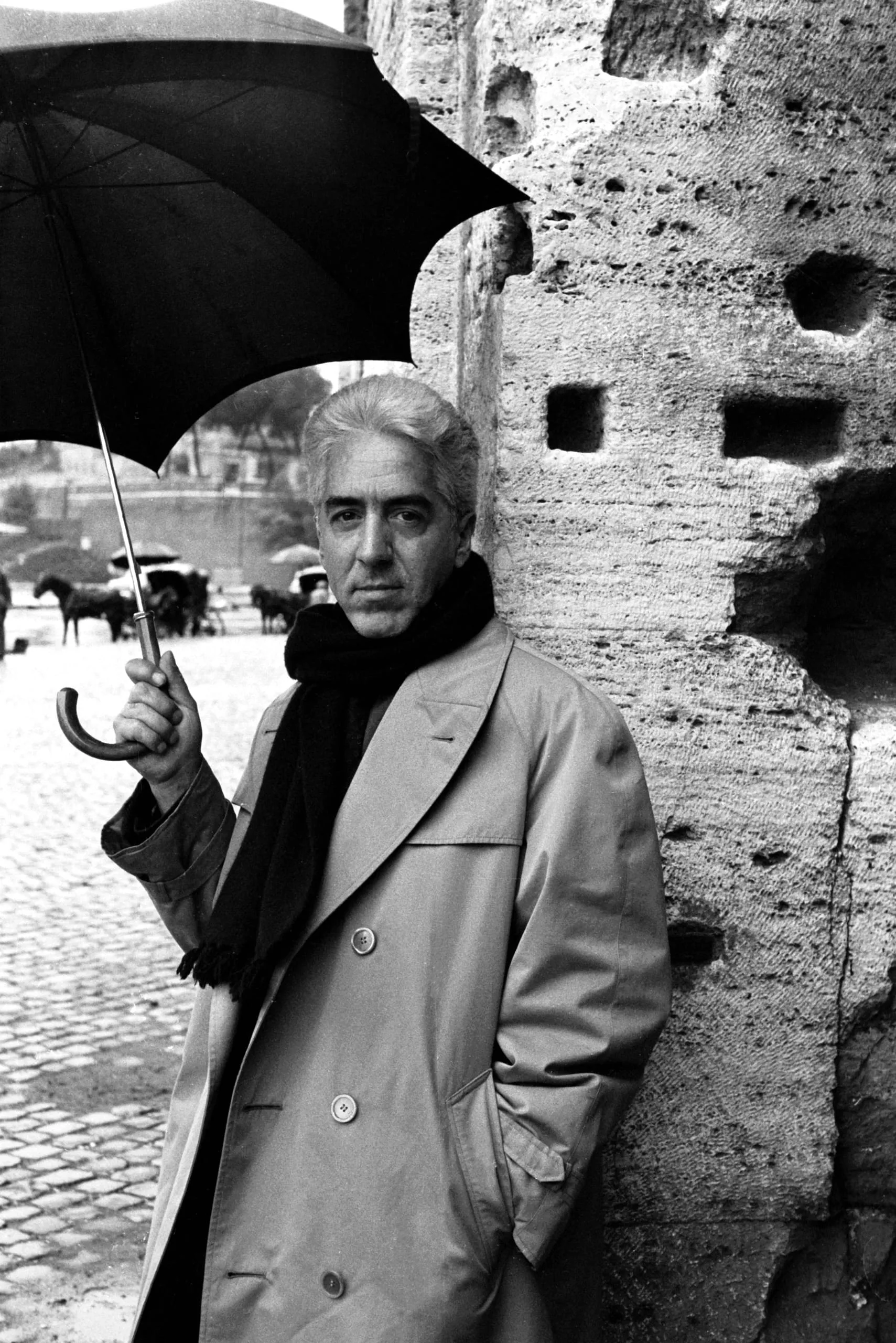 Black and white portrait photograph, white-haired man in trench coat and dark scarf leaning against a stone wall, holding an open umbrella, with a cobblestone street and horses in the background