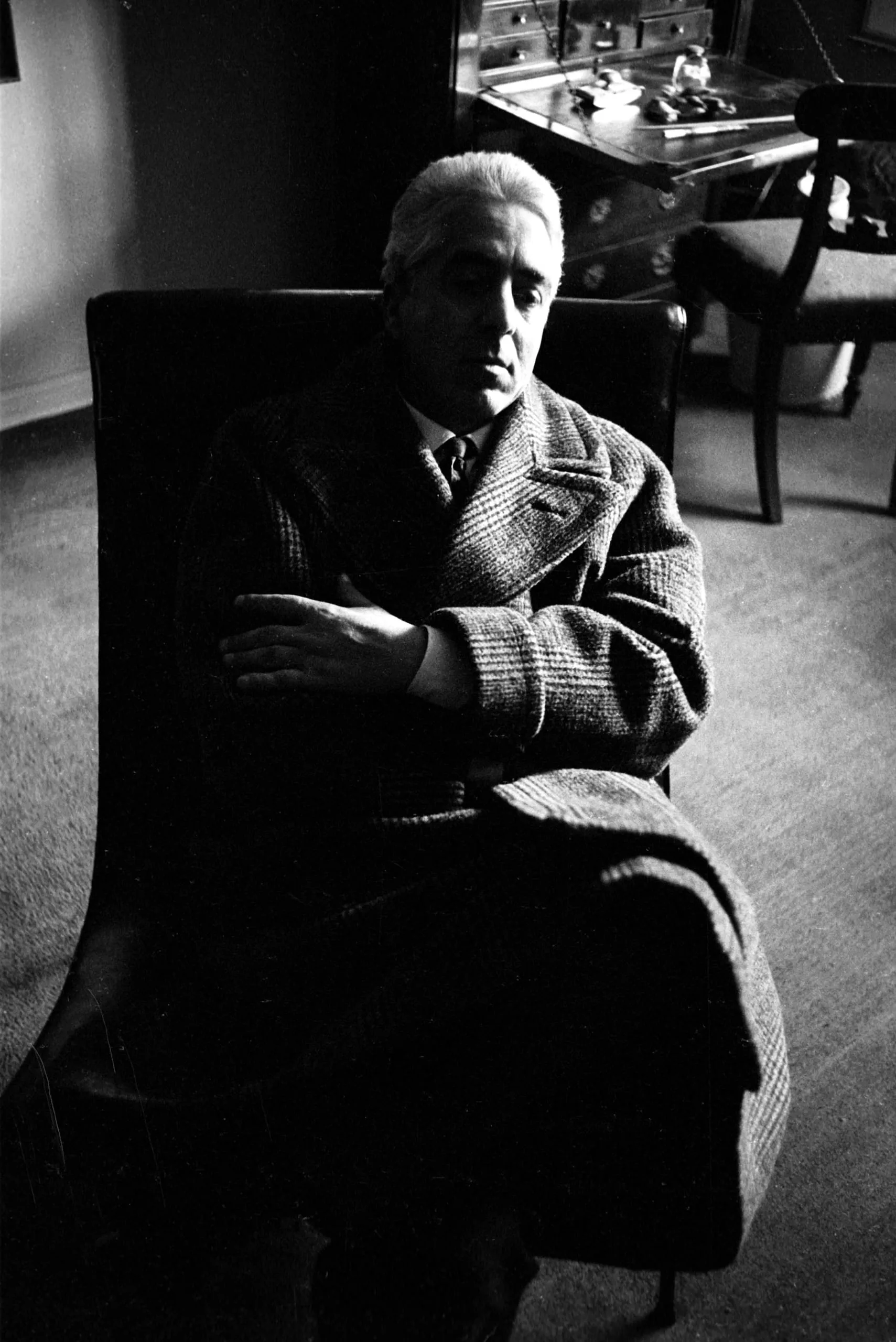 Black and white photograph, a white man with white hair seated in a dark armchair, arms crossed, lit sharply from the left with deep shadows