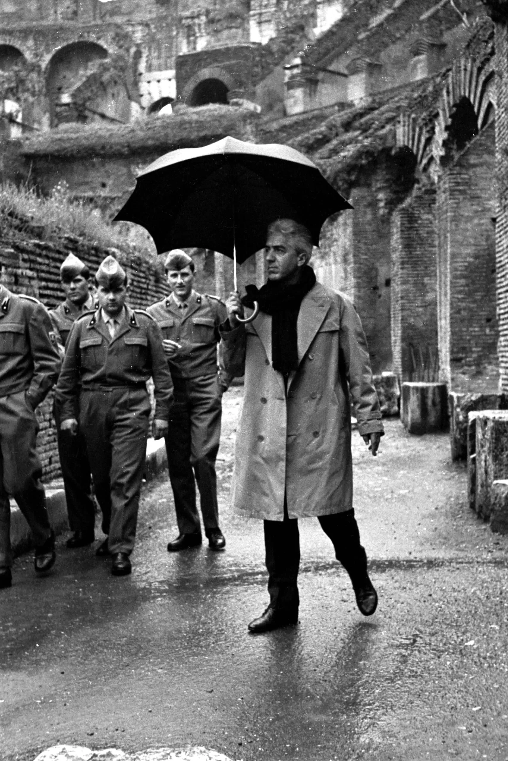 Black and white photograph of a man in a trench coat holding an umbrella on a rain-slicked path inside ancient ruins, followed by three men in military uniforms