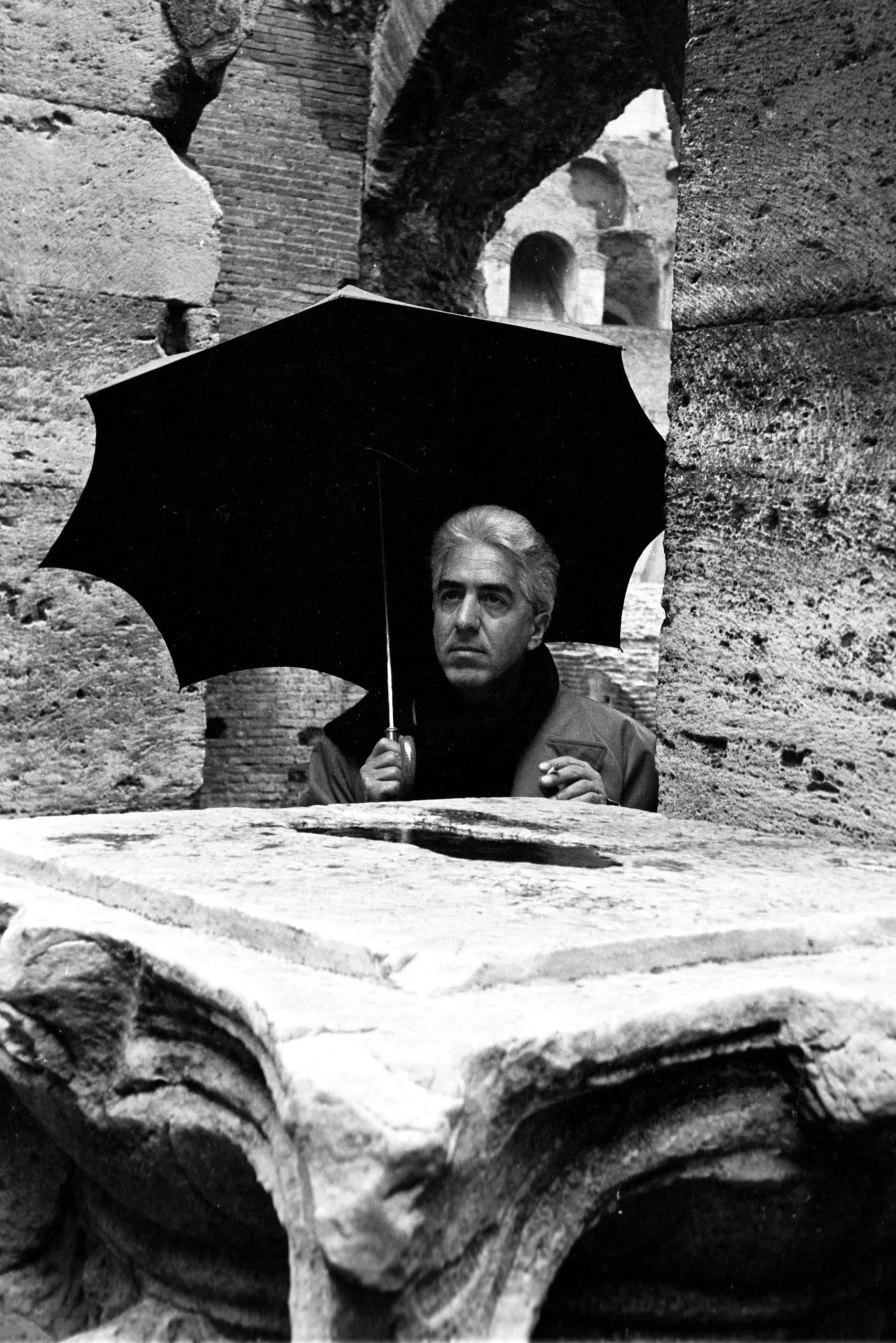 Black and white photograph of a man holding an open black umbrella, framed by a stone window opening in a large ancient ruin, a carved stone fragment in the foreground