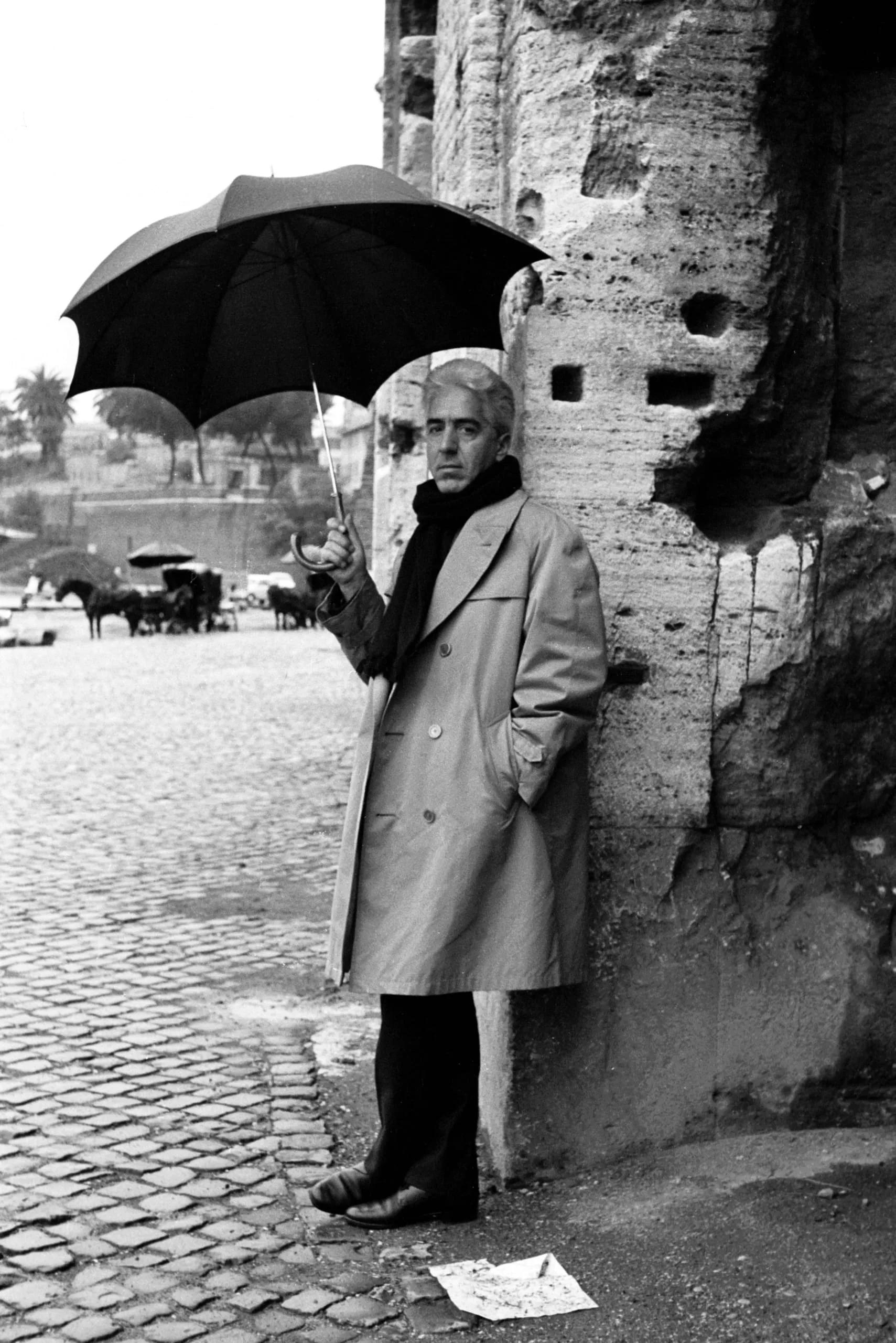 Black and white photograph, full-length portrait of a man in a trench coat holding an open umbrella, leaning against a weathered stone wall on a cobblestone street