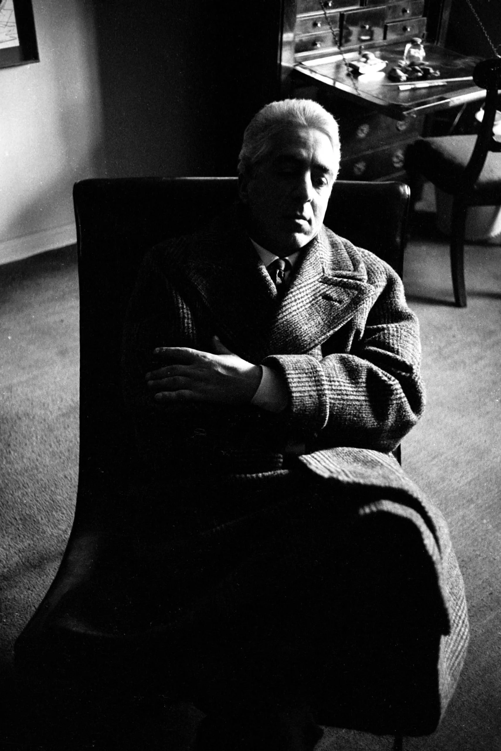 High-contrast black and white photograph of a heavyset man in a tweed overcoat seated in a dark armchair, arms folded, face turned downward, lit sharply from the left