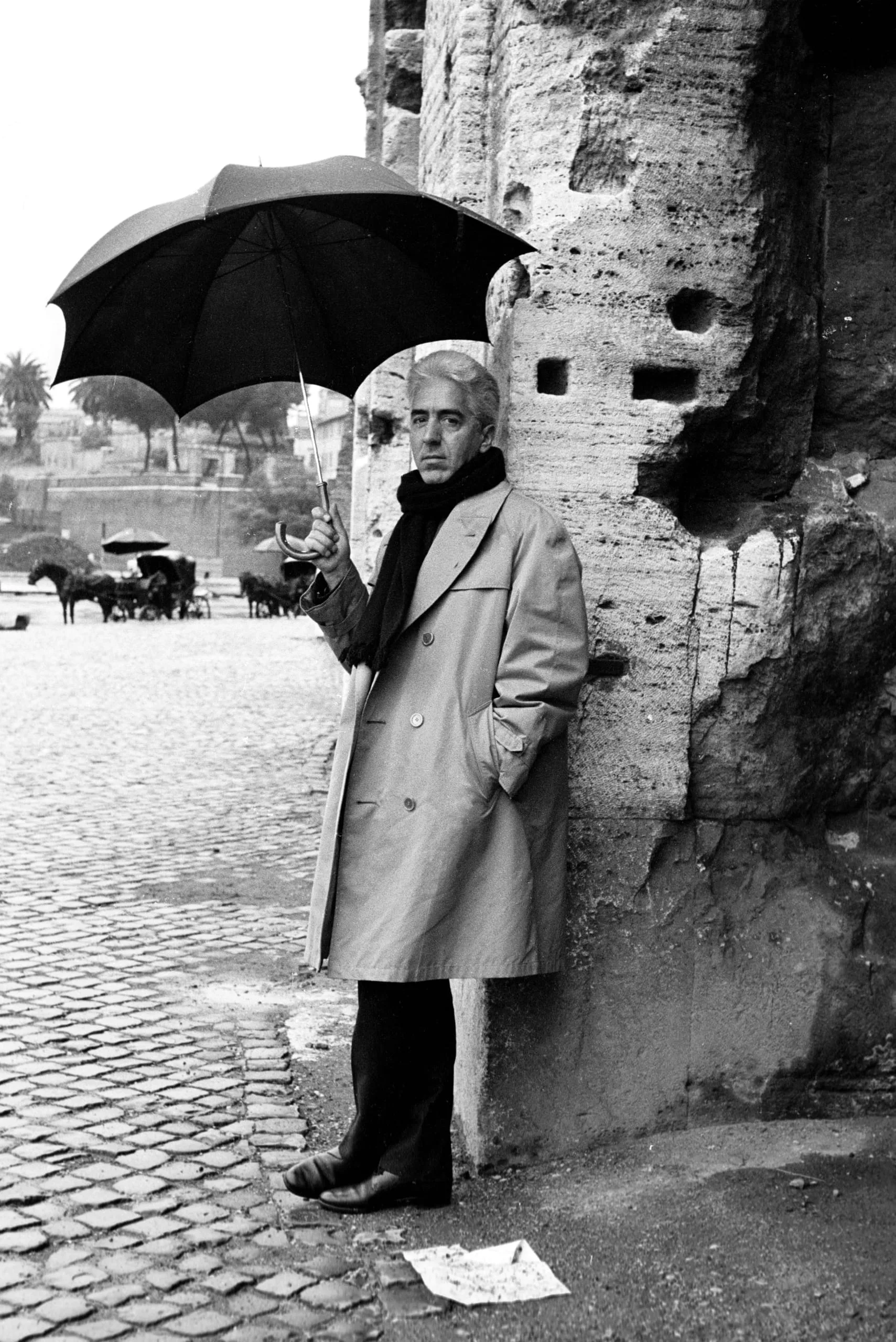 Black and white photograph, full-length portrait of a man in a trench coat leaning against ancient stone ruins, holding an open umbrella over cobblestones