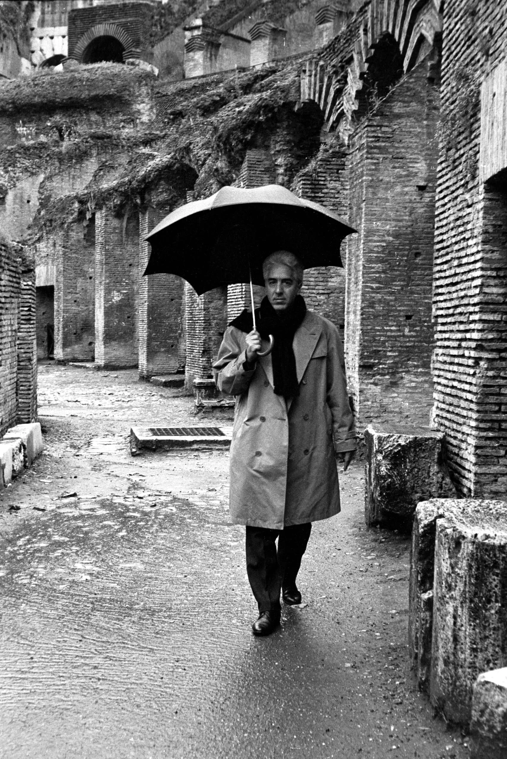 Black and white photograph of a man in a trench coat holding an open umbrella, walking toward the camera through ancient Roman ruins on a wet day