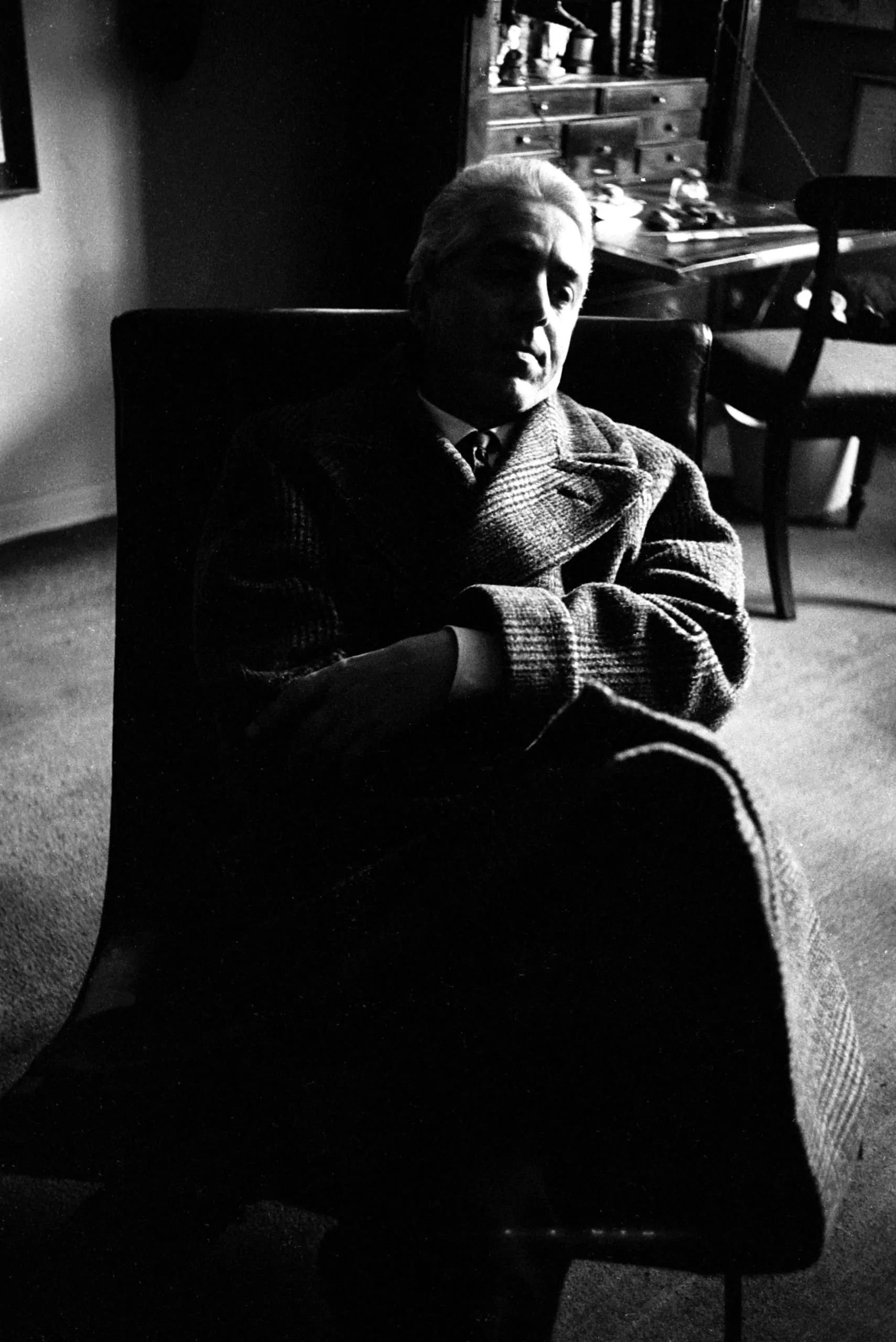 High-contrast black and white portrait photograph of a white-haired man seated in a dark armchair, arms crossed, lit sharply from the right with deep surrounding shadows