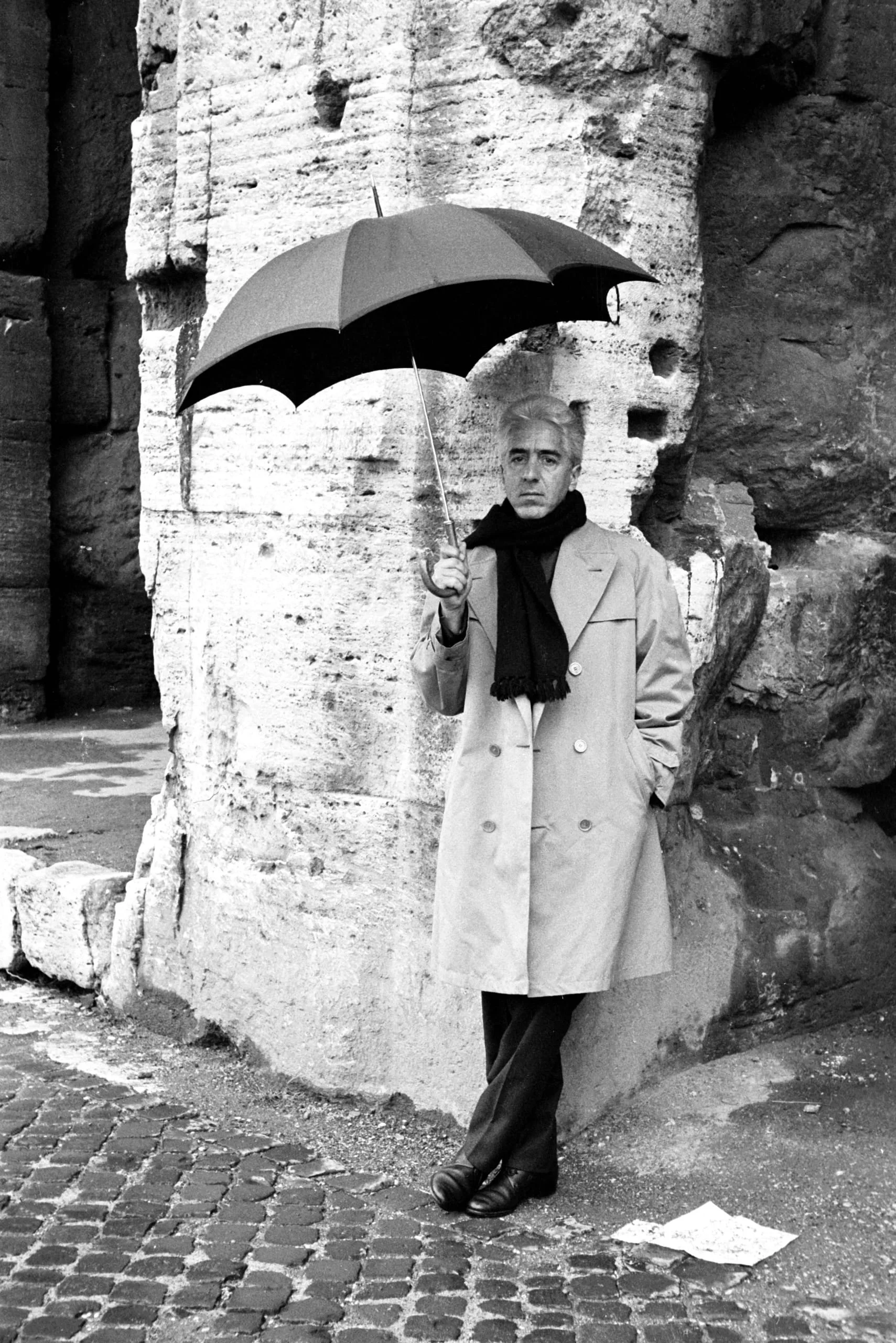 Black and white full-length photograph of a man in a trench coat and scarf holding an open umbrella, standing against a large ancient stone wall on wet cobblestones