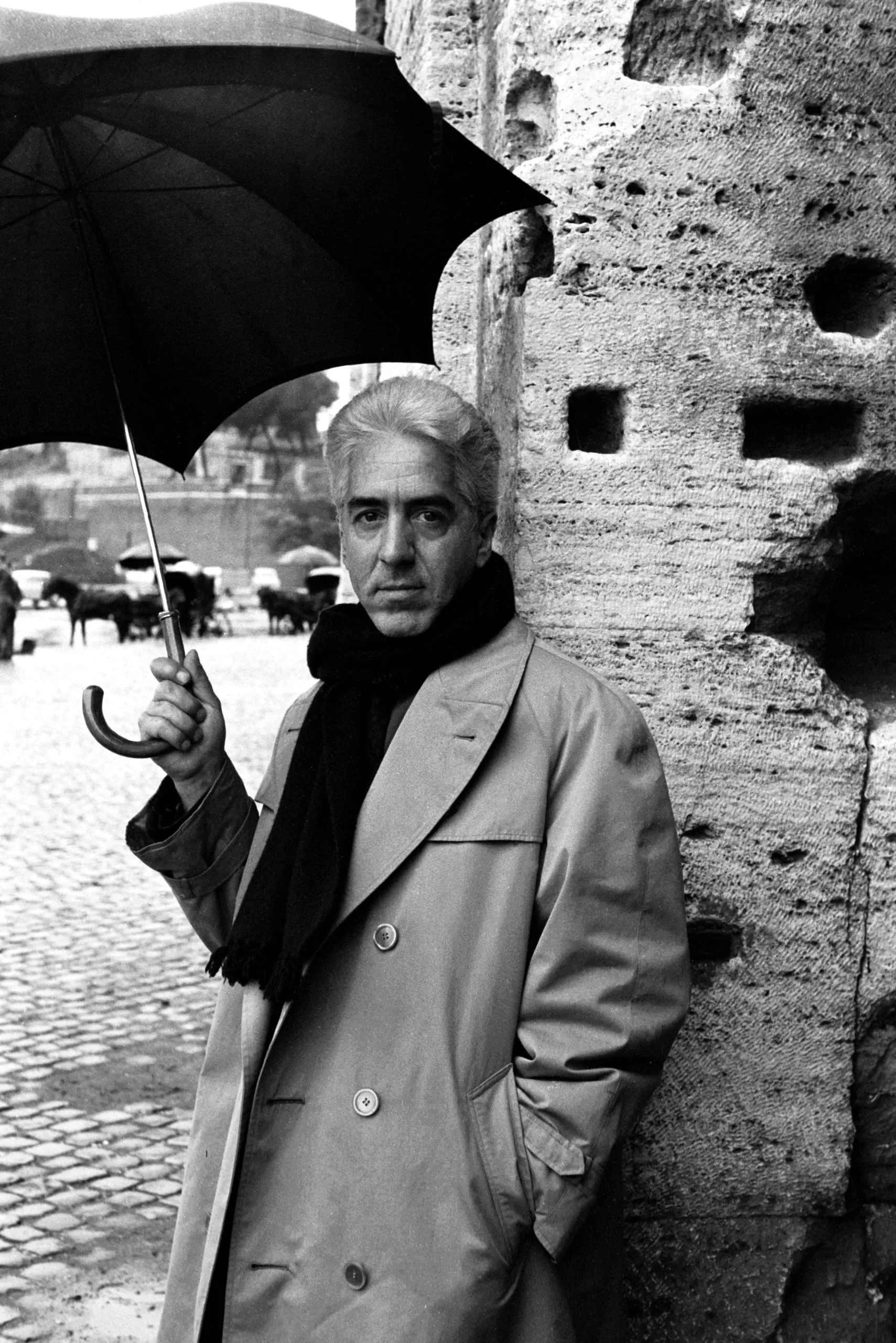 Black and white portrait photograph, white man in a trench coat holding an open umbrella beside a pitted stone wall, cobblestone street and horses visible in the soft-focus distance