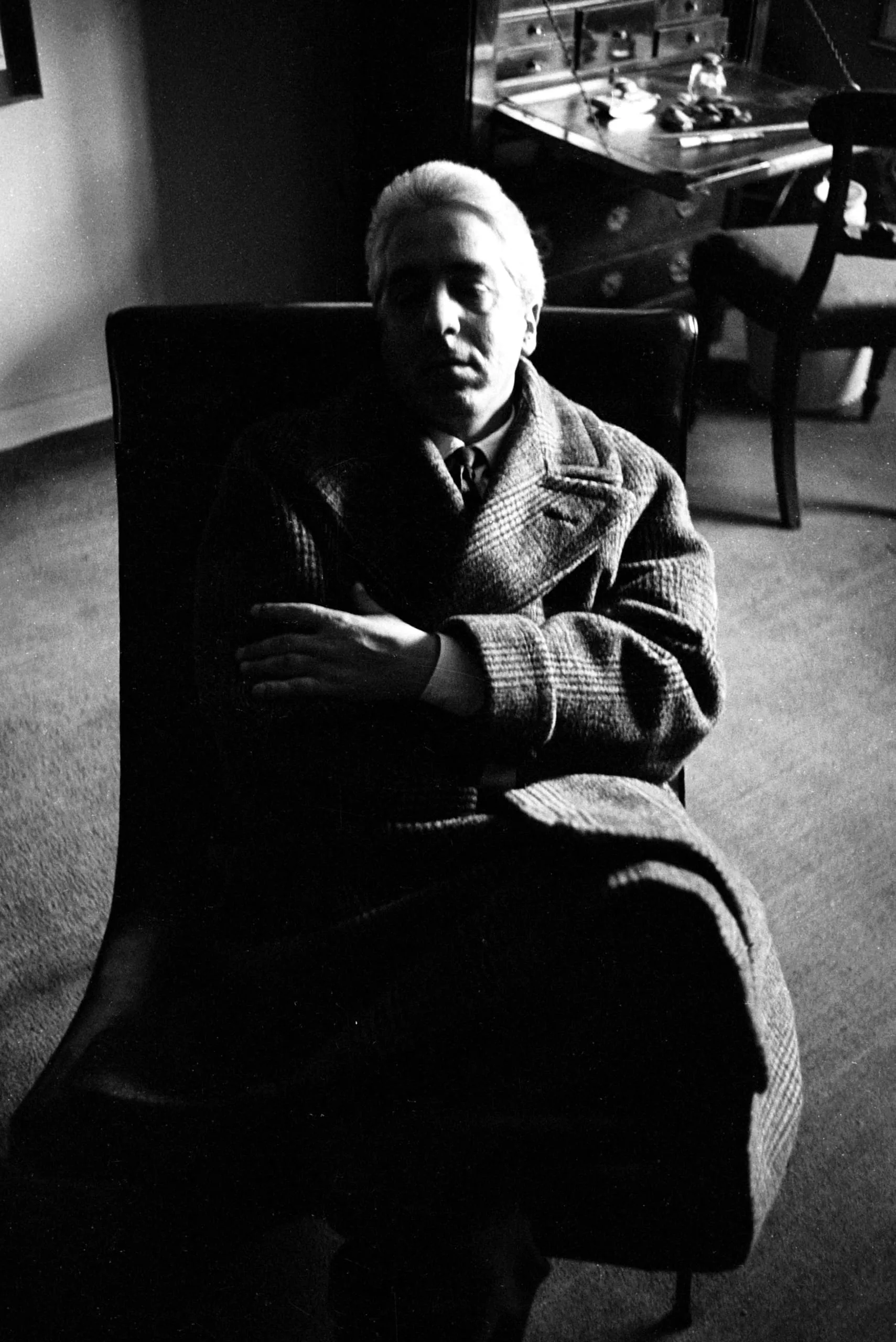 Black and white photograph of a white man with white hair seated in a dark armchair, arms crossed, lit dramatically from above