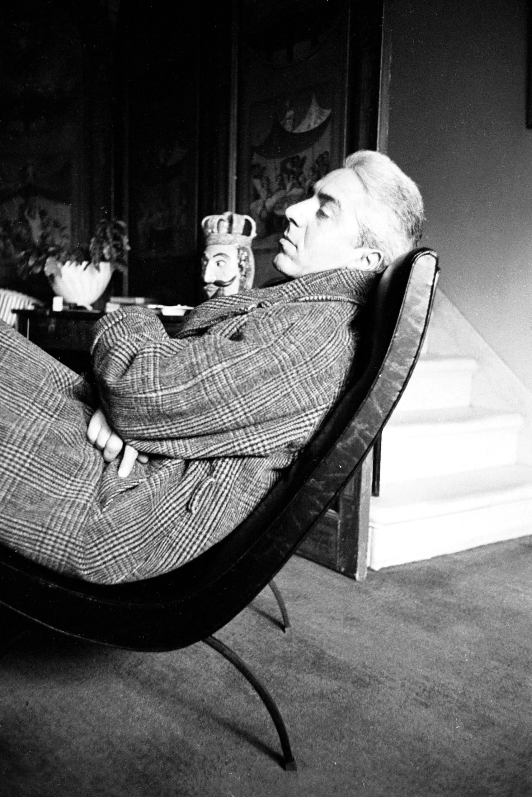 Black and white photograph of a gray-haired man in a plaid suit reclining in a curved low lounge chair, face in profile looking upward, interior setting with decorative objects behind him