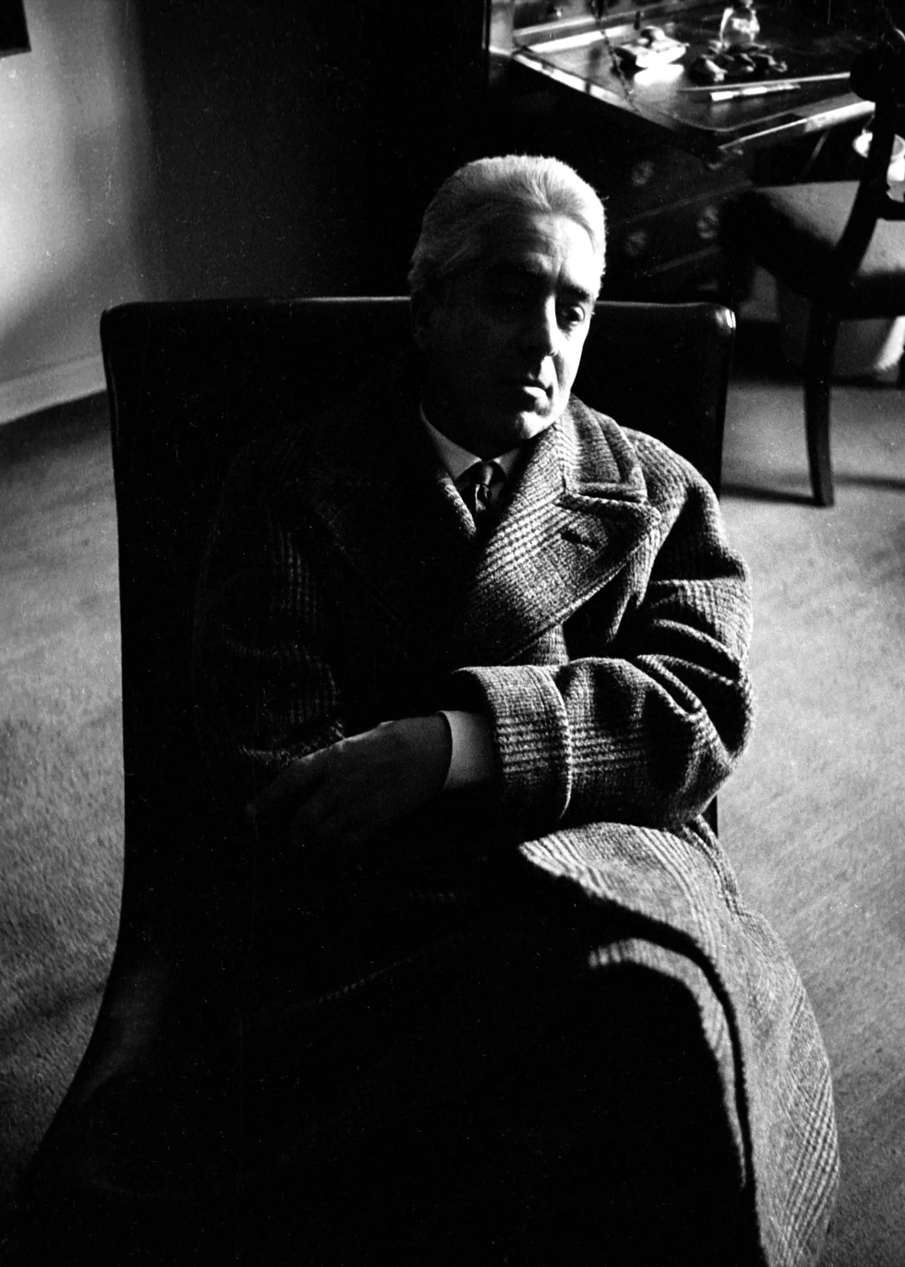 Black and white photograph of a white man with white hair seated in a dark armchair, arms crossed, lit dramatically from above right with deep surrounding shadows