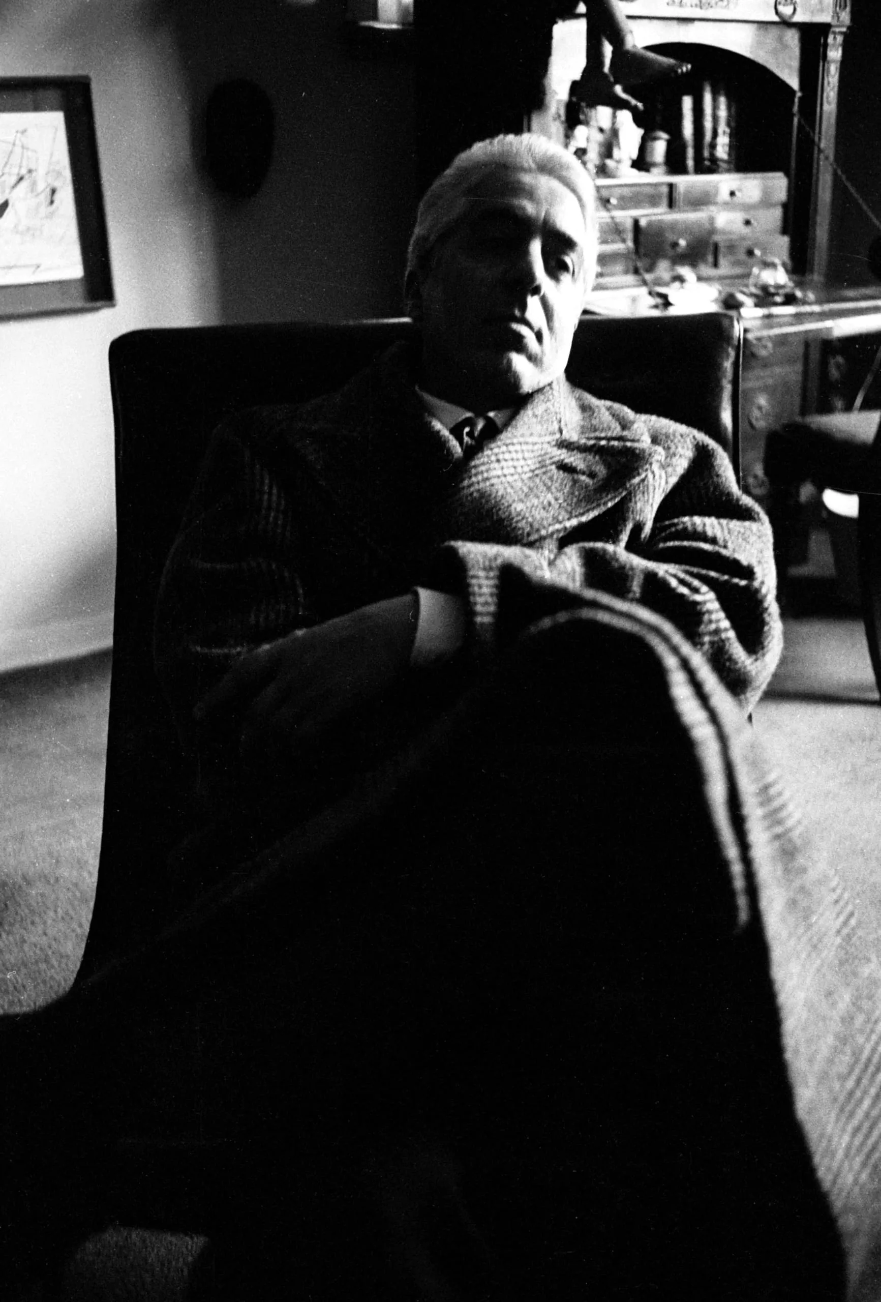 High-contrast black and white photograph of a man in a tweed overcoat reclining in a dark armchair, face lit from above, legs foreshortened toward camera