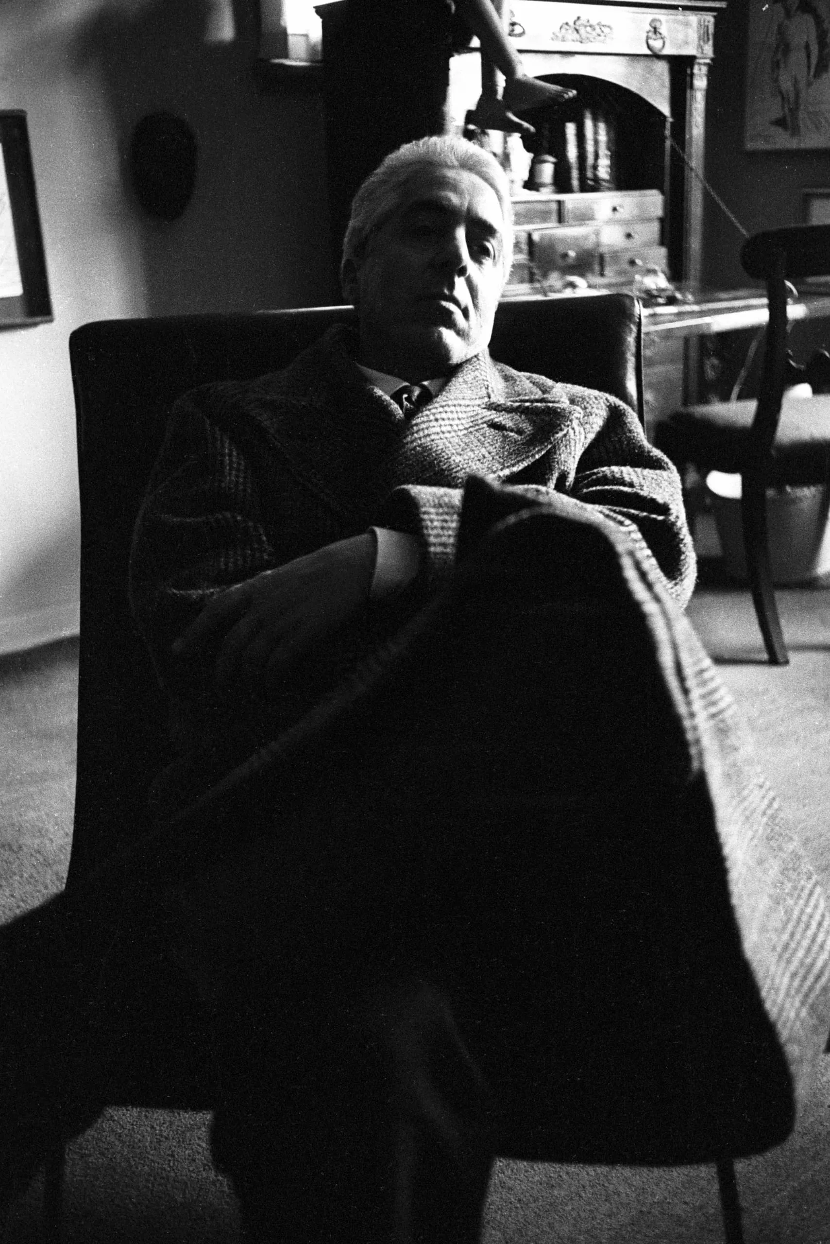 Black and white photograph of a white man with pale hair seated in a dark armchair, arms folded, one leg crossed toward the camera, lit by strong directional light from the right