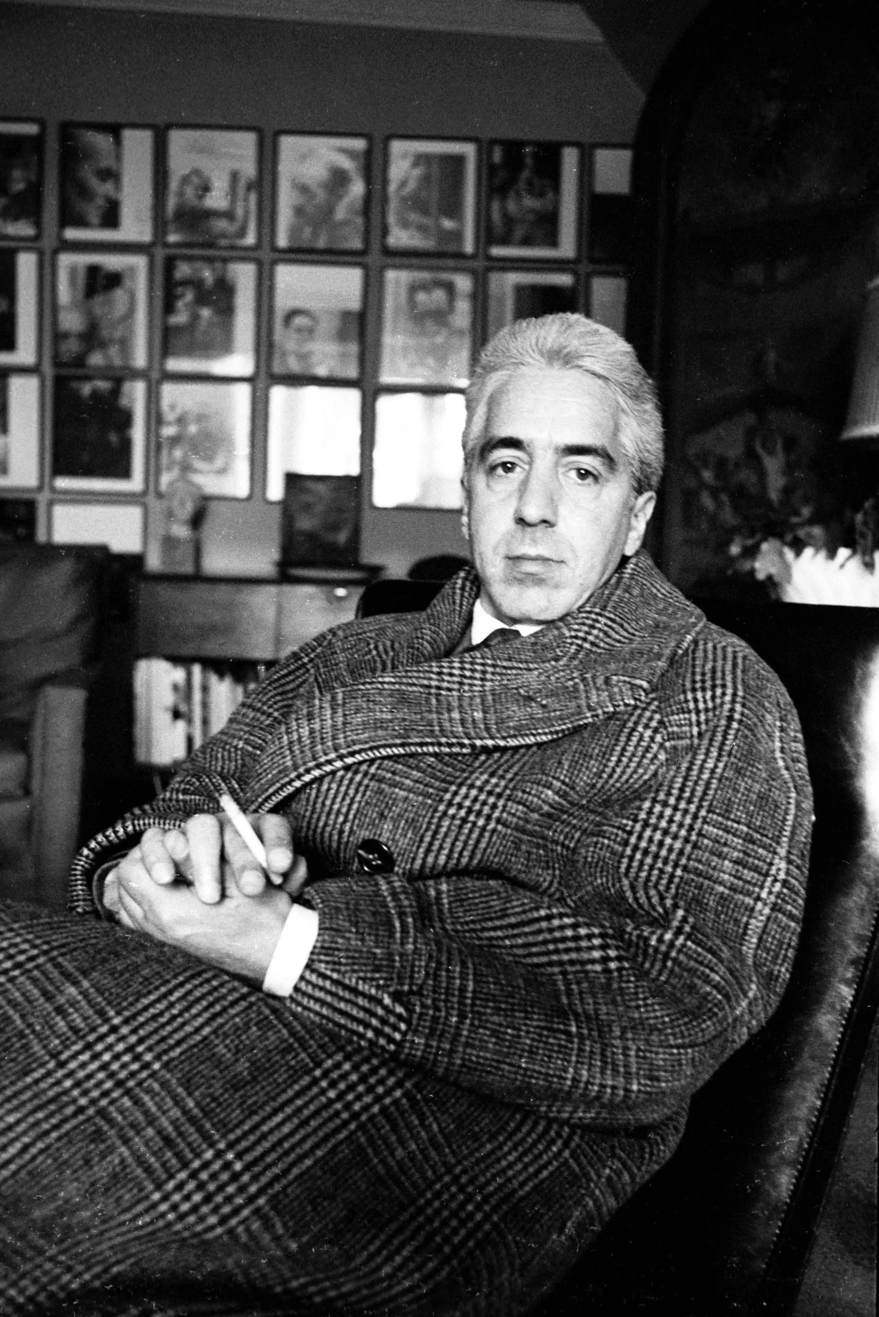 Black and white photograph, man in a glen plaid overcoat seated in a dark chair, holding a cigarette, looking directly at the camera, framed pictures covering the wall behind him
