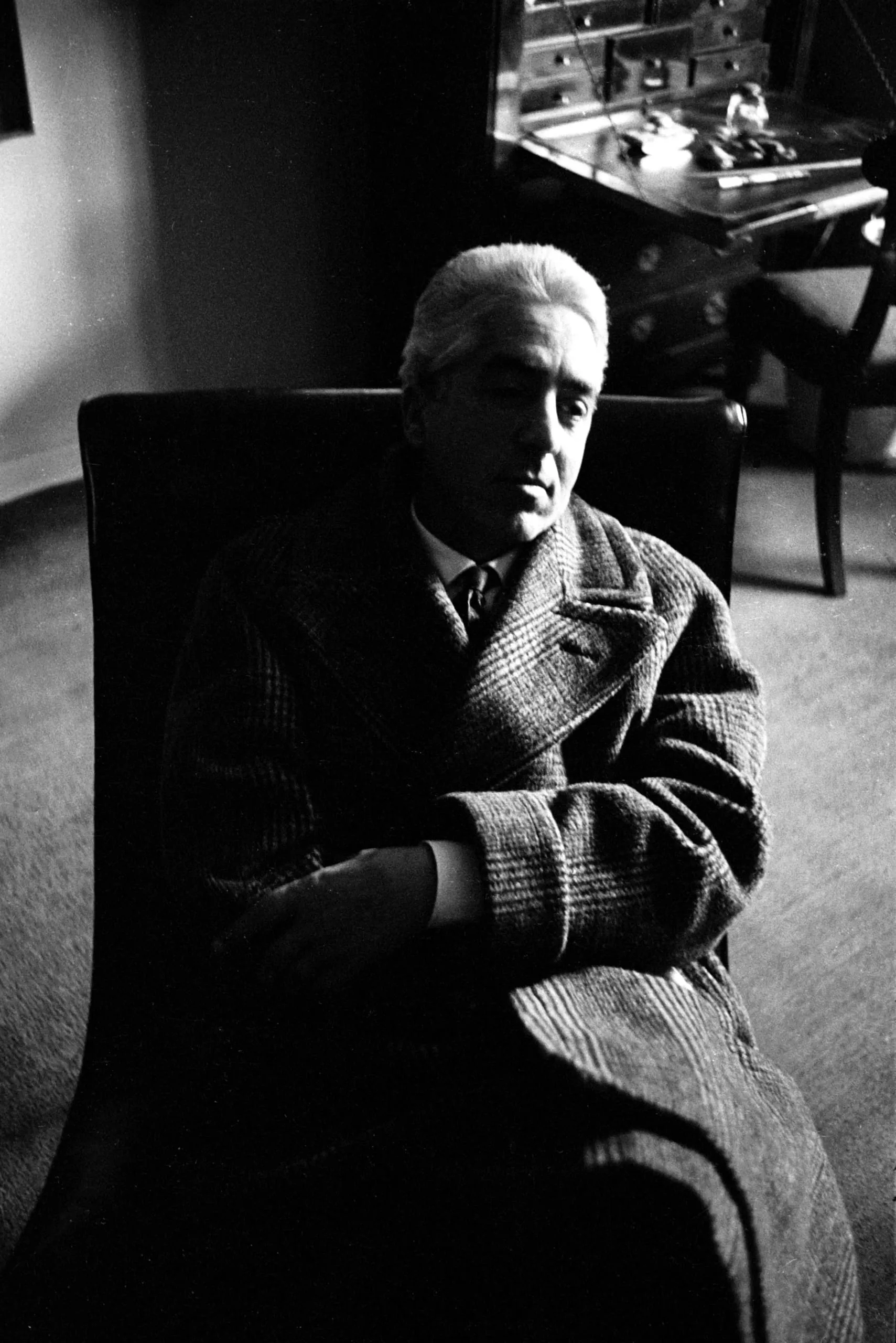 Black and white photograph of a white-haired man seated in a dark armchair, lit dramatically from the left, wearing a plaid overcoat and striped tie, looking downward