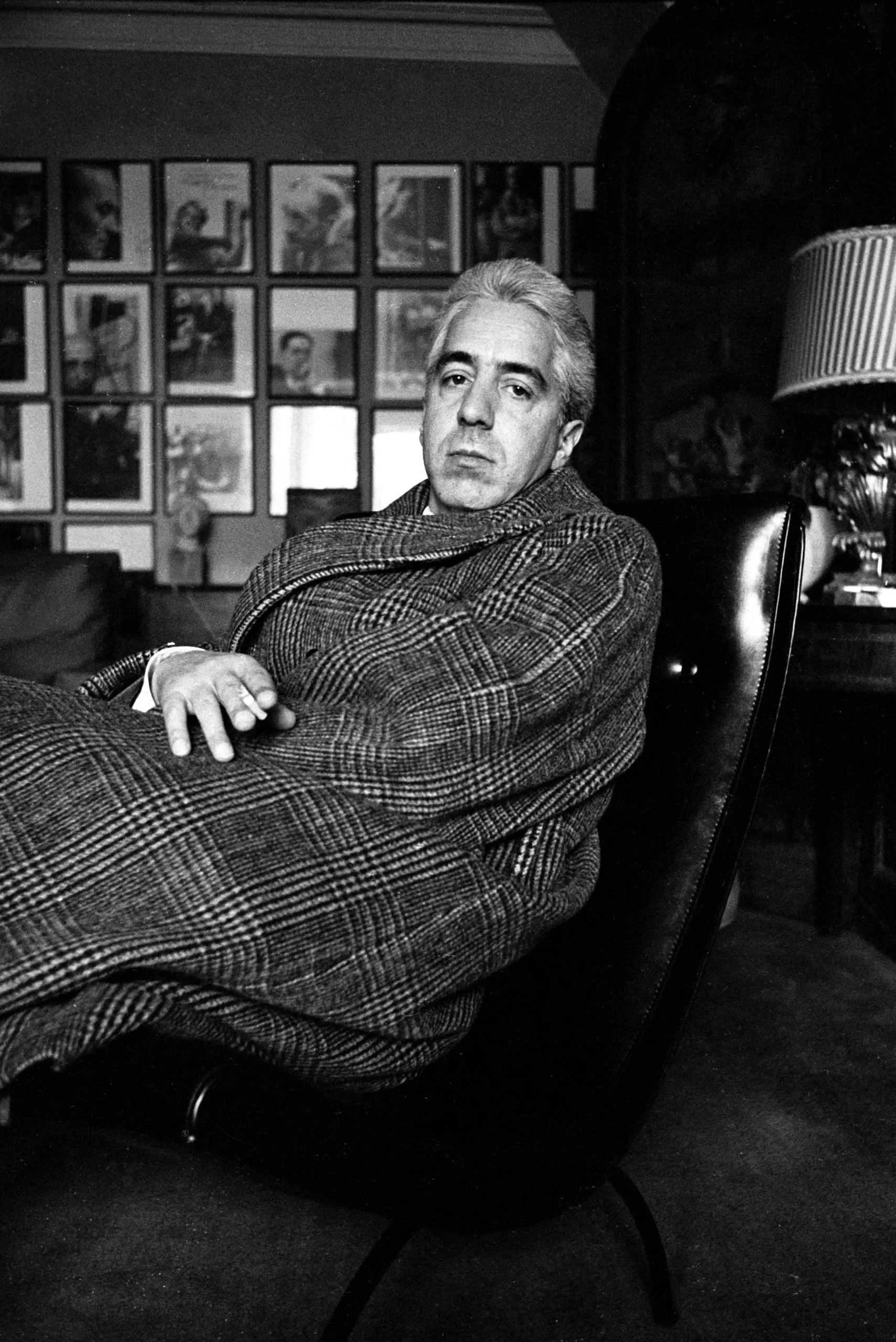 Black and white photograph of a man in a plaid overcoat seated in a curved leather chair, looking directly at the camera, cigarette in hand