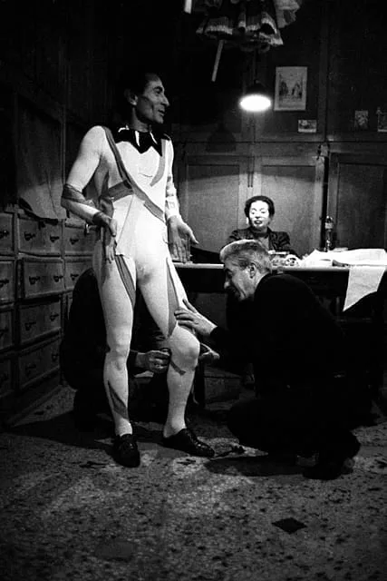 Black and white photograph of a man in a white full-body leotard standing in a cluttered room while another man crouches to examine his knee; a woman sits at a table in the background