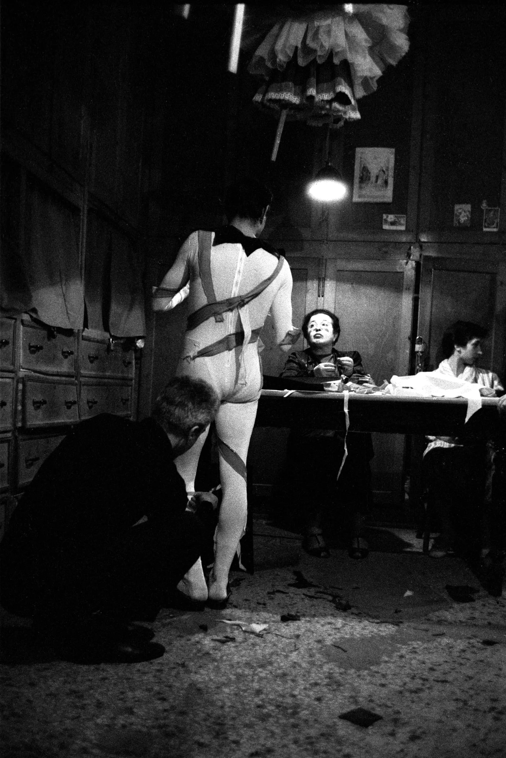 Black and white photograph of a person in a striped bodysuit standing in a dimly lit room, shot from behind, with onlookers seated at a cluttered table