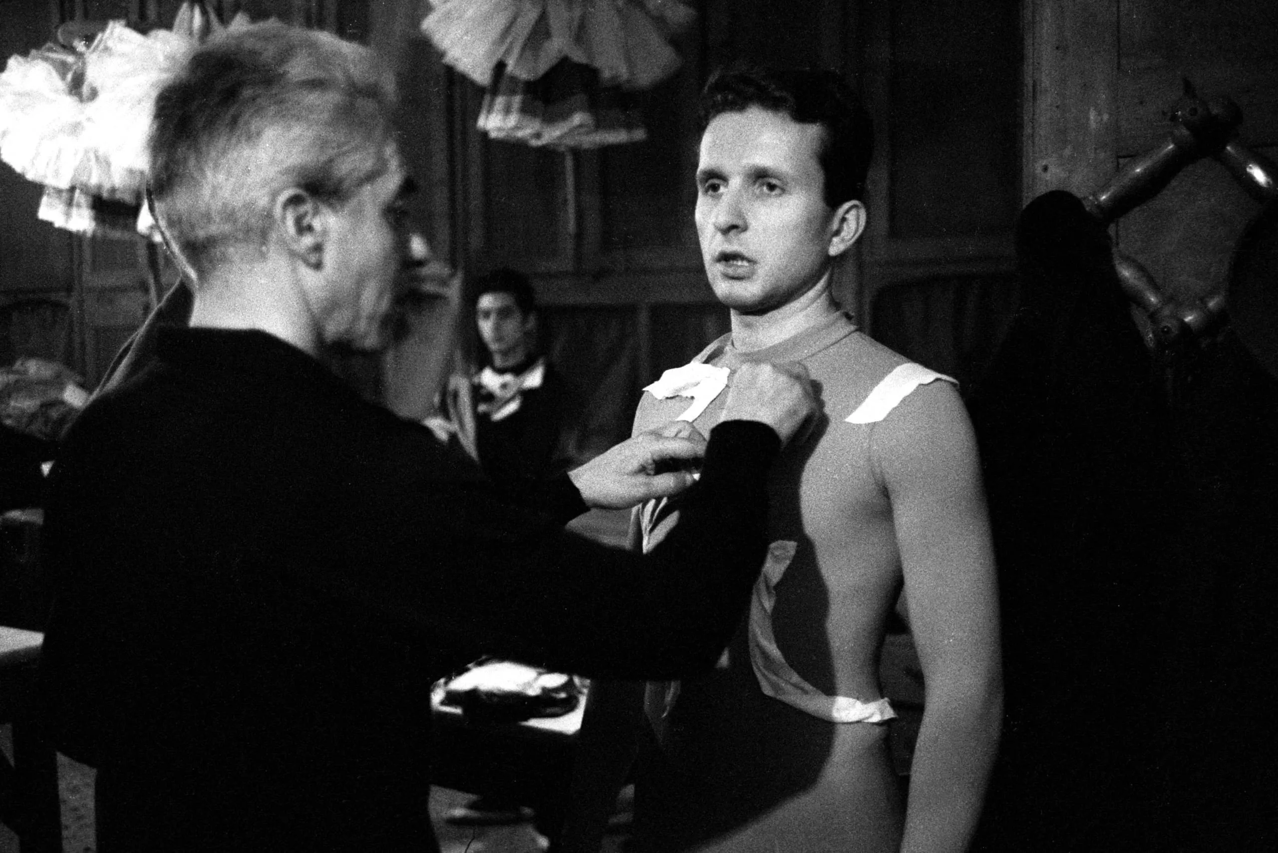 Black and white photograph, backstage scene with a person in dark clothing adjusting the costume of a man in a sleeveless bodysuit, a third figure visible in the shadows behind