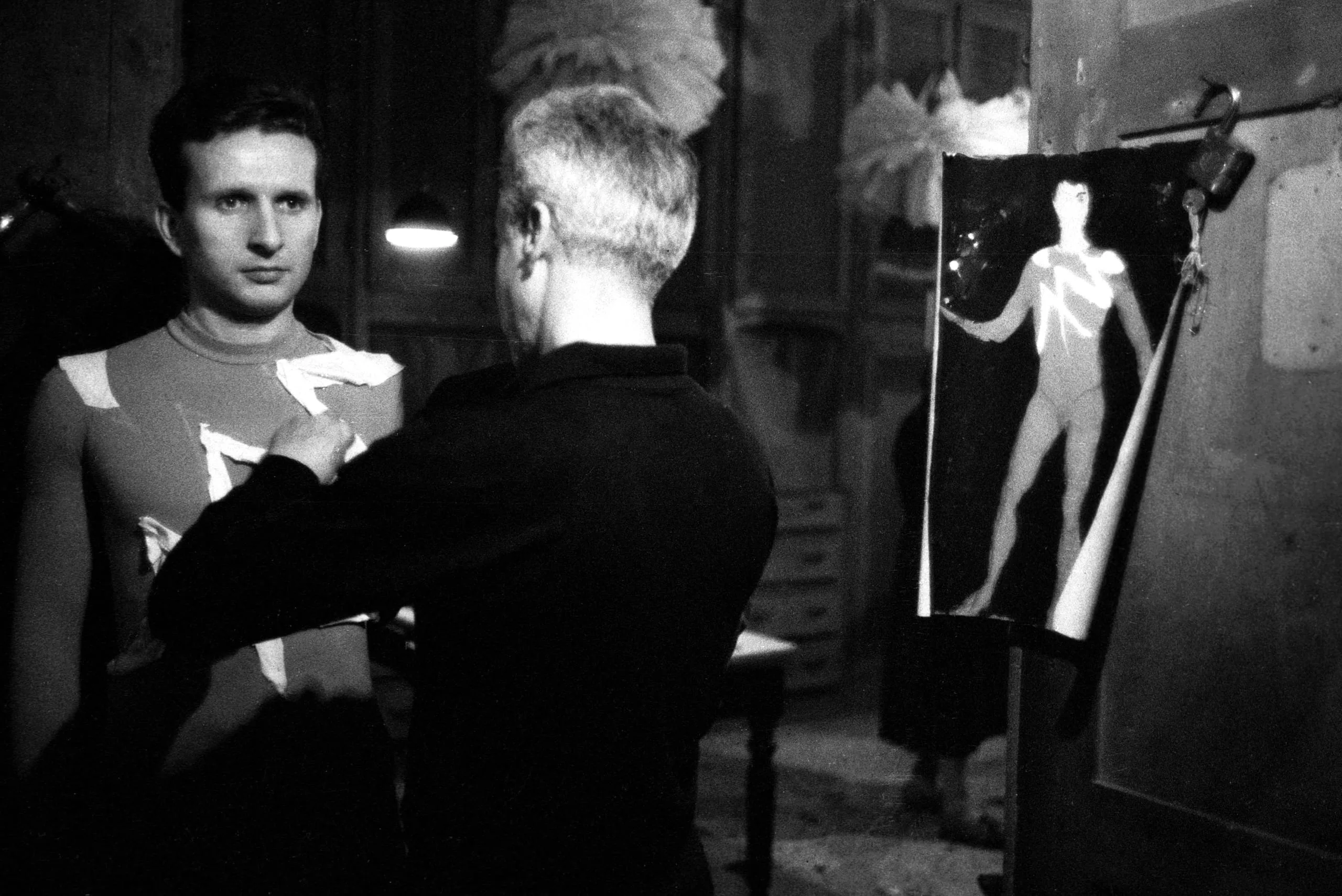 Black and white photograph of two men in a dim interior, one in a patterned costume facing the camera while the other adjusts the costume from behind, with a painted figure on an easel to the right
