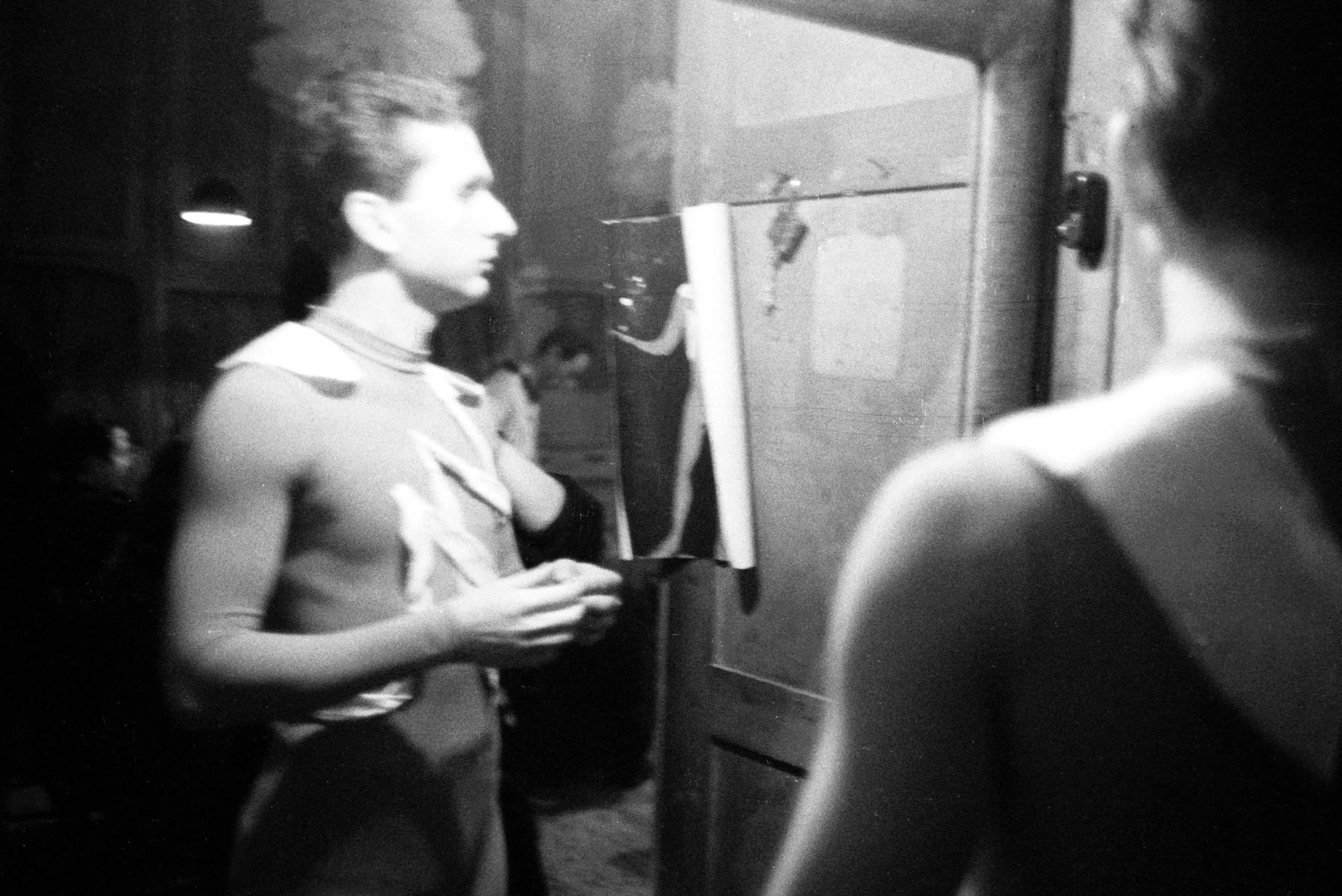 Black and white photograph, two figures in a dimly lit interior, central man in profile wearing sleeveless top with arms outstretched, second figure cropped at right edge