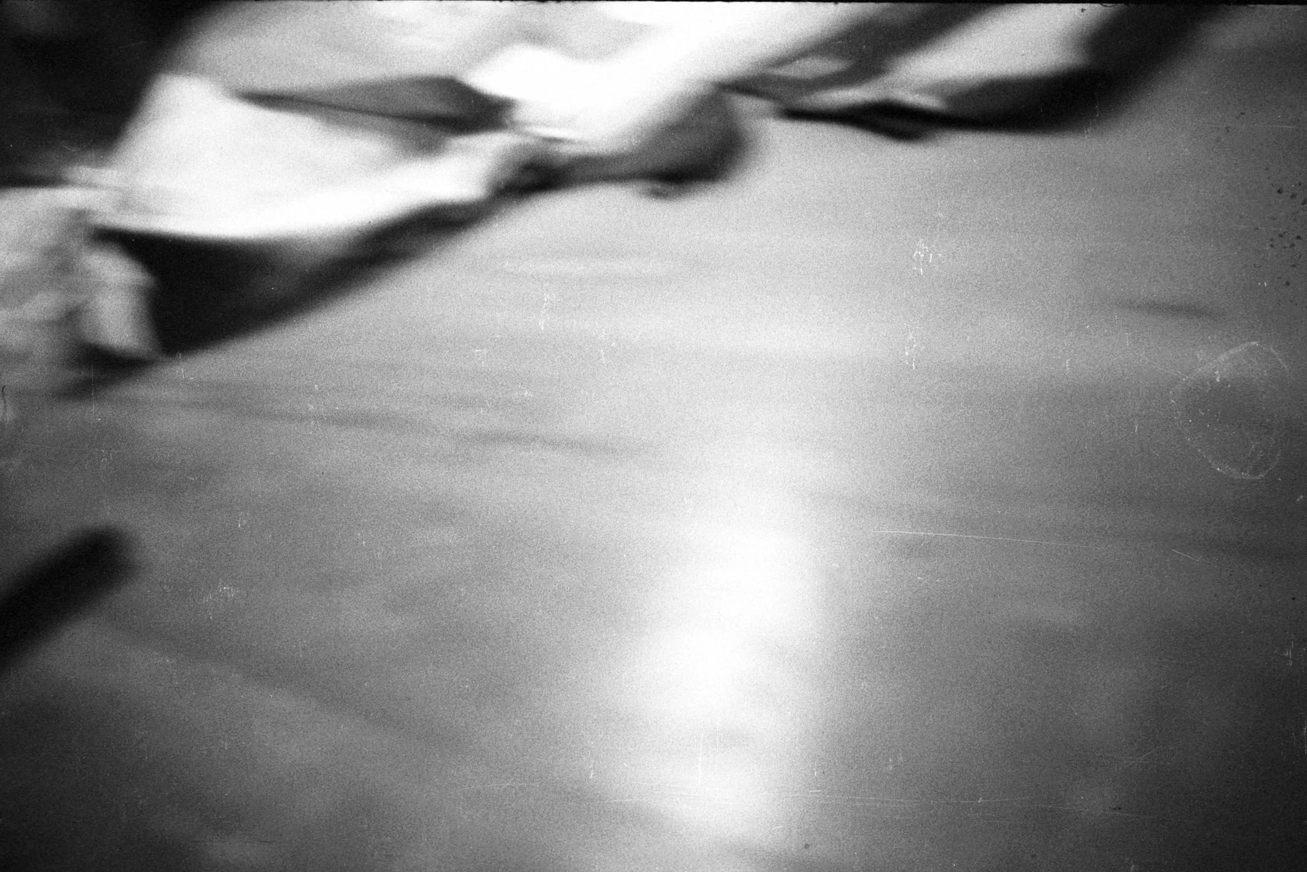 Black and white photograph with extreme motion blur, pale reflective floor surface lit from center-right, white-clad figures streaking across upper edge