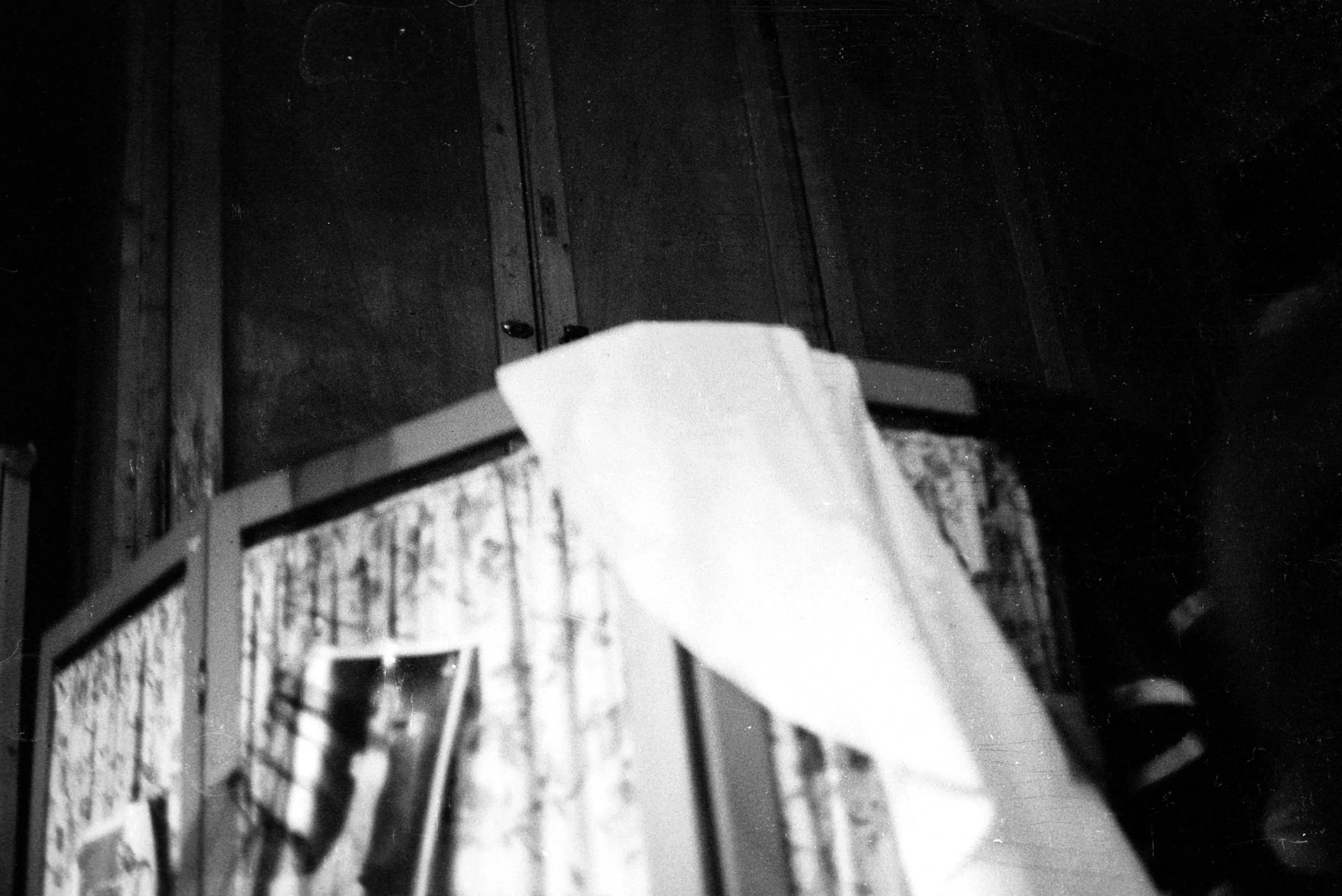Black and white photograph of a blurred interior, with a bright white sheet of paper tilting diagonally over printed materials pinned to a surface