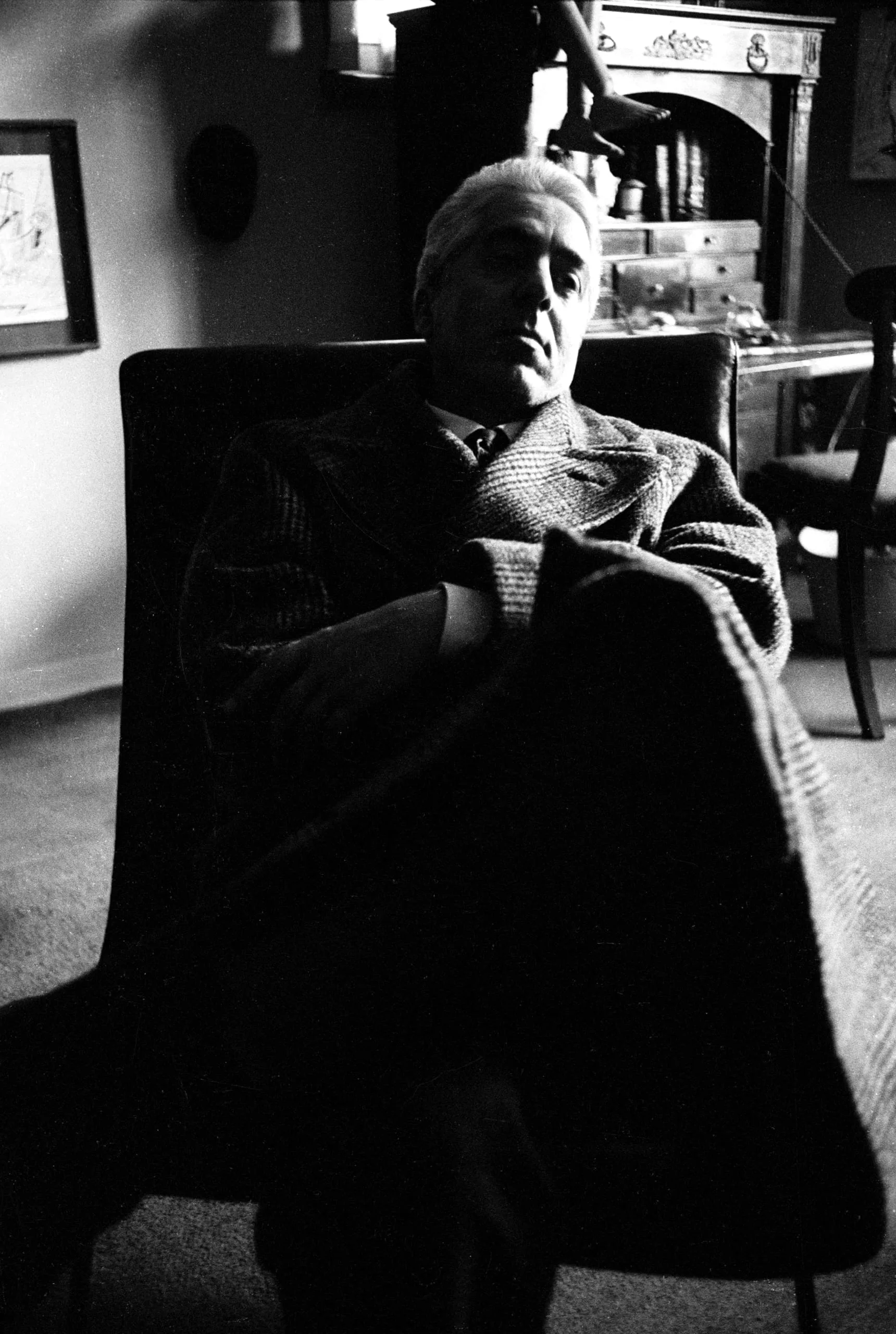 High-contrast black and white photograph, white man with gray hair seated in a dark armchair, lit dramatically from the right, wearing a tweed jacket