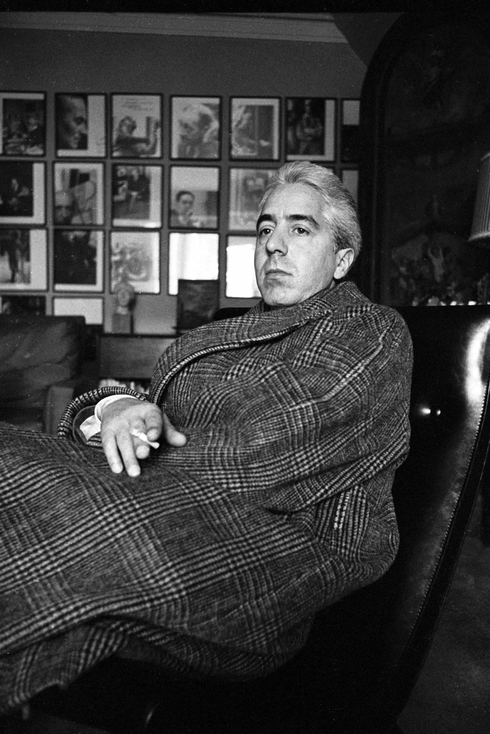 Black and white photograph of a white-haired man in a heavy plaid overcoat seated in a leather armchair, holding a cigarette, with framed images covering the wall behind him