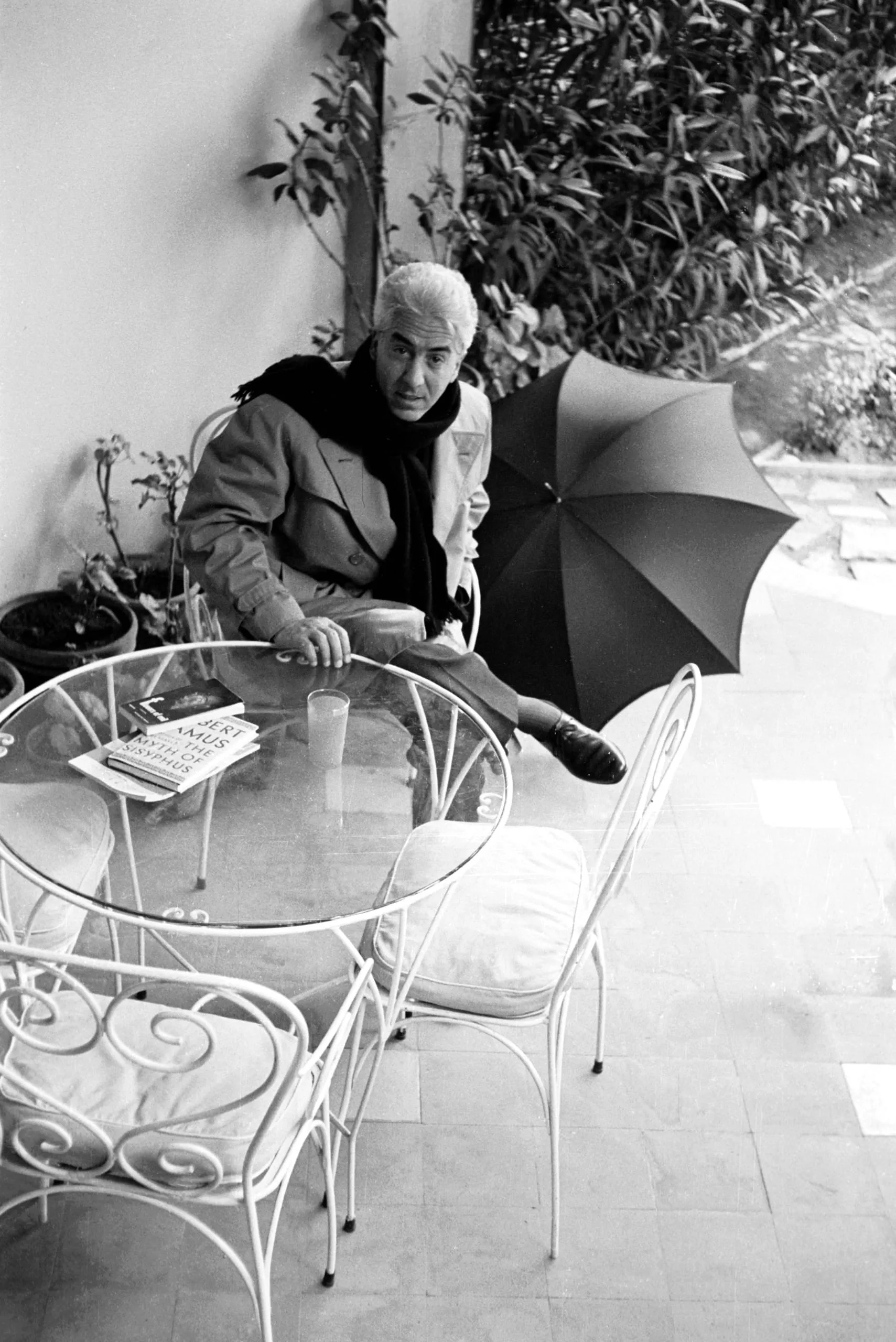 Black and white photograph of an older man with gray hair seated at a glass-topped wrought-iron garden table, looking up at the camera, with an open umbrella and a book visible nearby