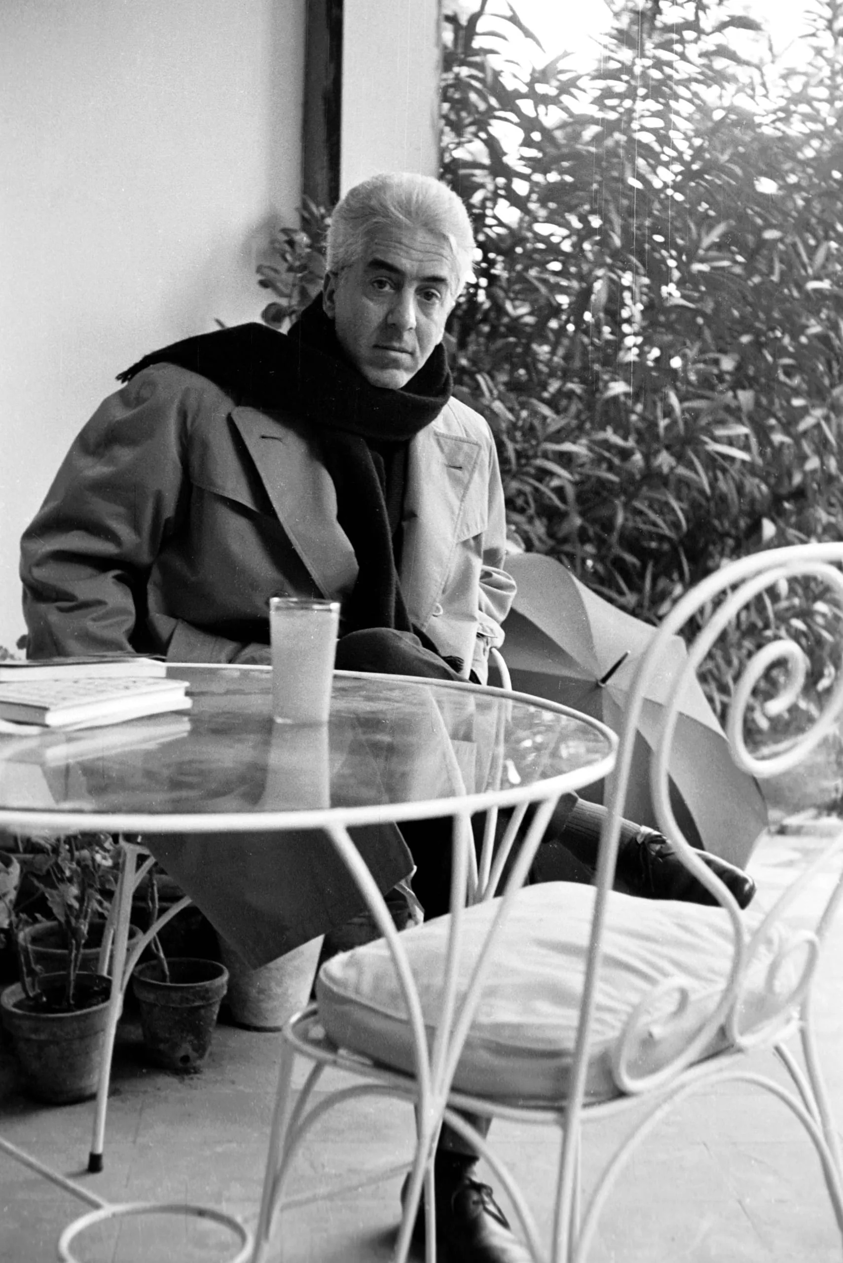 Black and white photograph of a gray-haired man in a trench coat seated at a glass patio table, chin resting in hand, looking directly at the camera