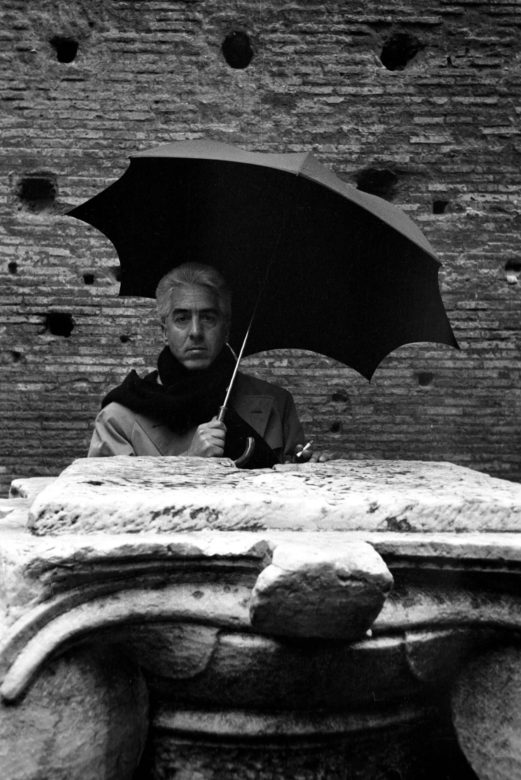 Black and white photograph of a man behind a weathered stone column capital, holding an open black umbrella, with a hole-pocked ancient brick wall behind him