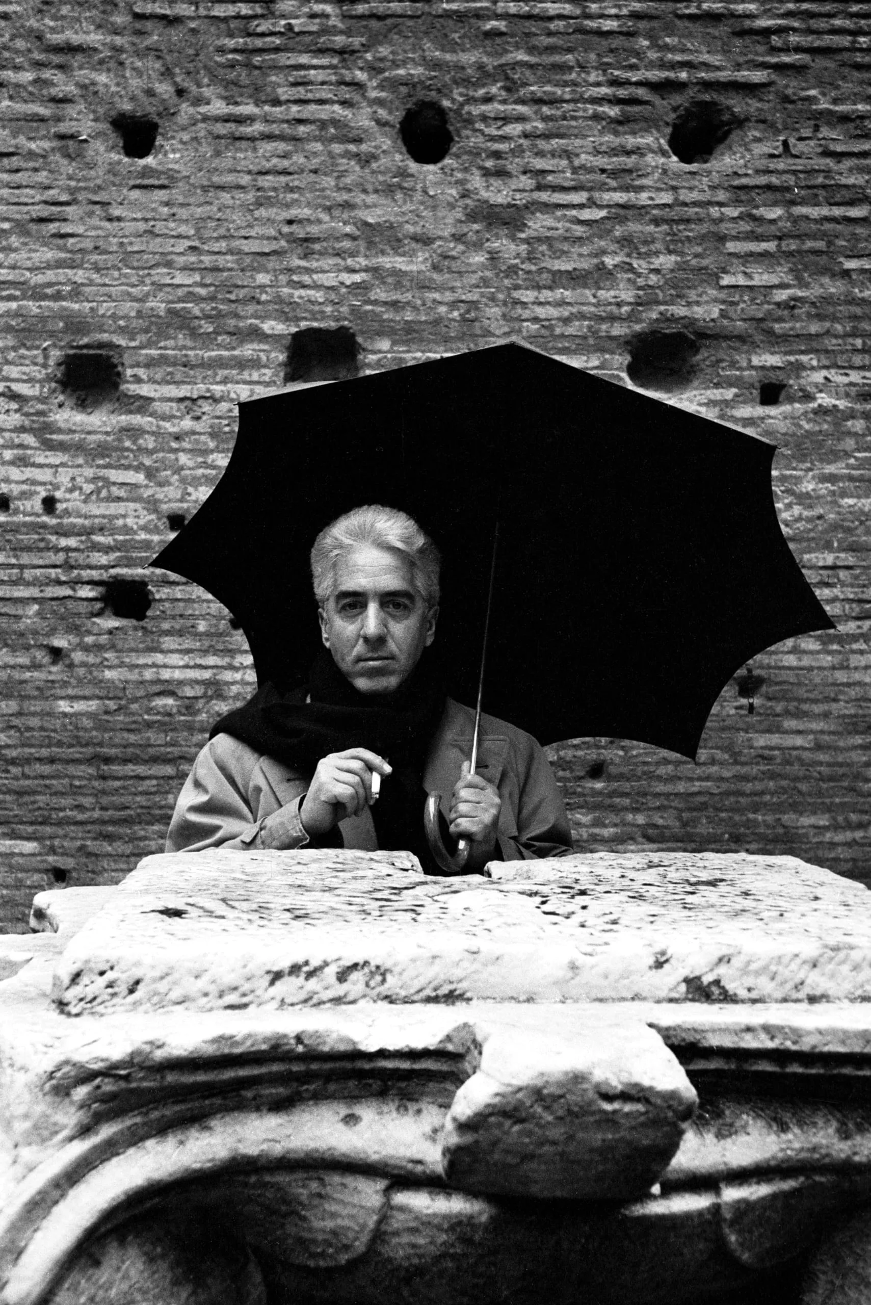 Black and white photograph, a man from the chest up standing behind a carved stone ledge, holding an open dark umbrella, with a pitted ancient brick wall behind him