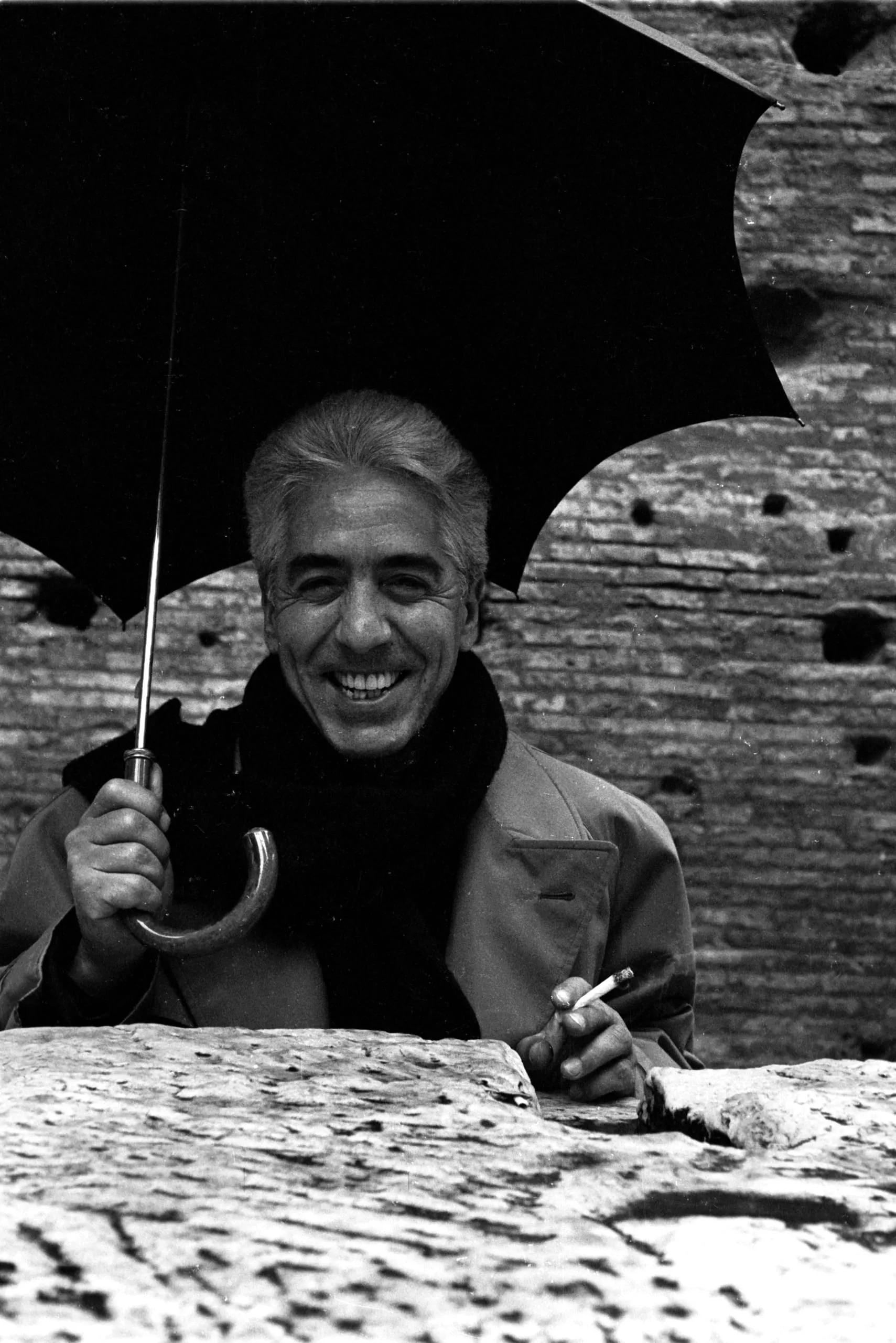 Black and white photograph of a smiling man holding an umbrella and a cigarette, leaning against a stone ledge with a weathered brick wall behind him
