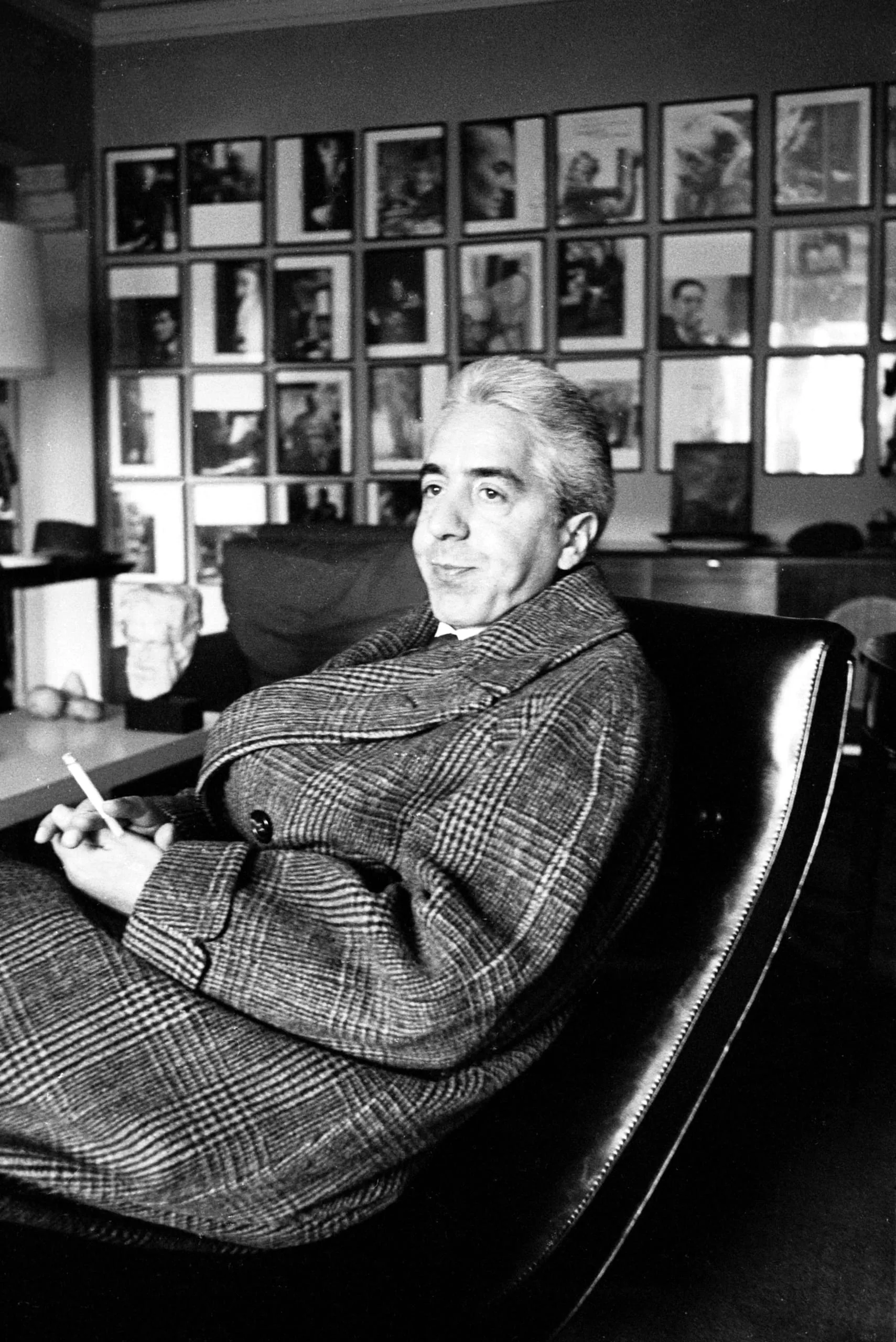 Black and white photograph of a heavyset man in an oversized plaid overcoat seated in a leather chair, holding a cigarette, with a wall of framed images behind him