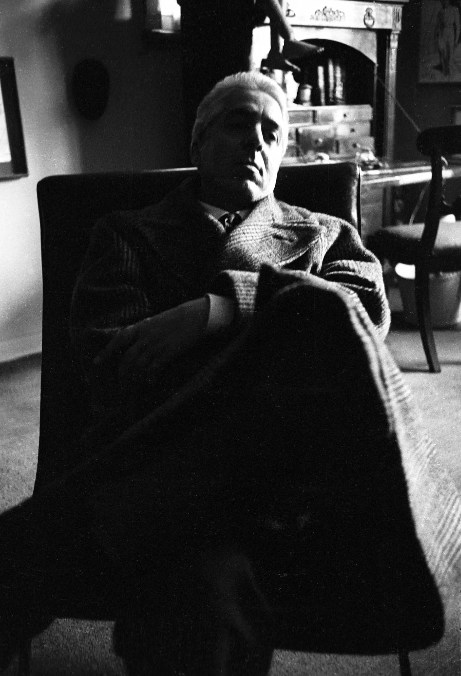 Black and white photograph of a white man with light hair seated in a dark armchair, head tilted back, lit dramatically from the left, interior room visible behind him