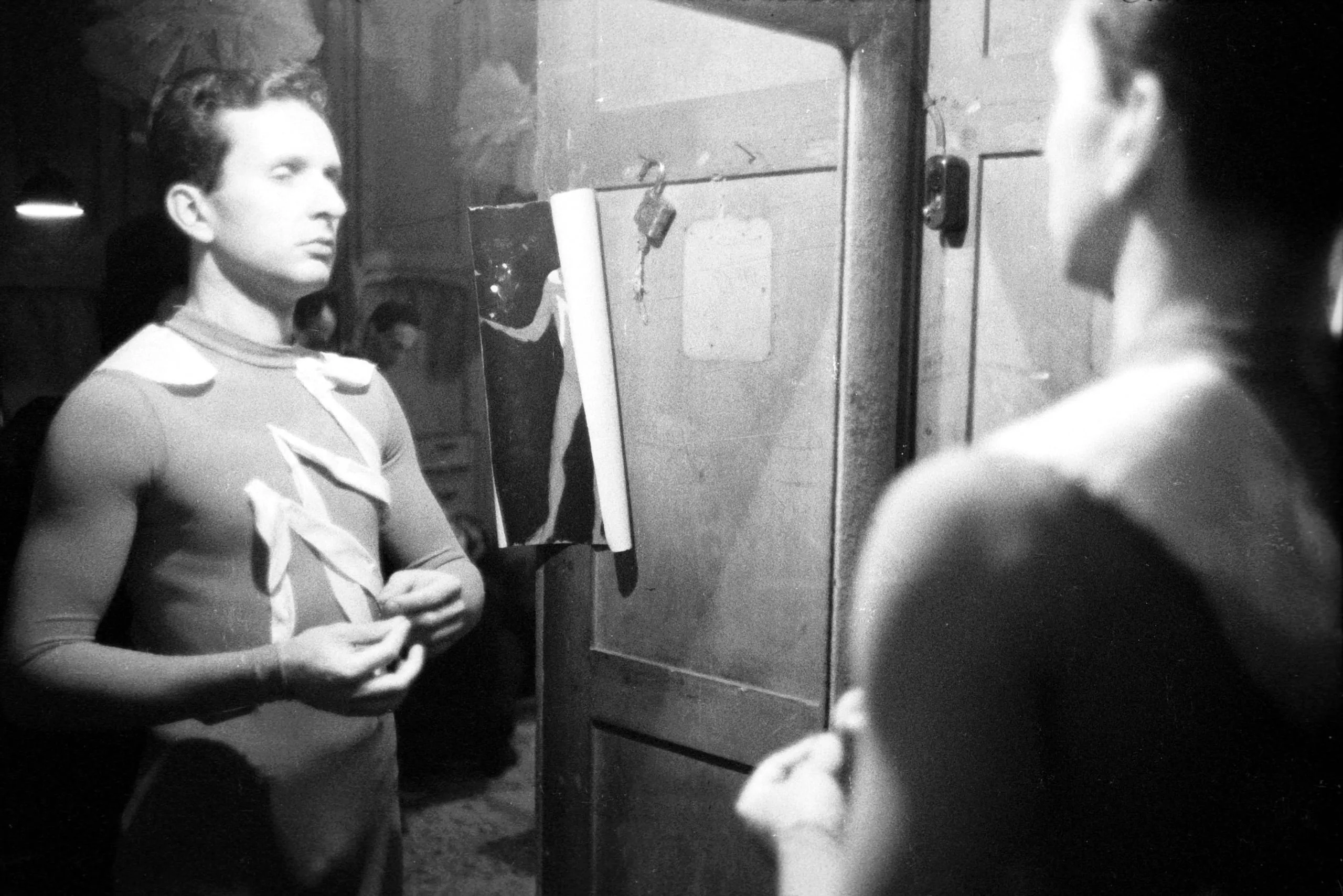 Black and white photograph of a man in a form-fitting costume with angular decorative pieces adjusting his outfit backstage, a wooden door between him and a second figure