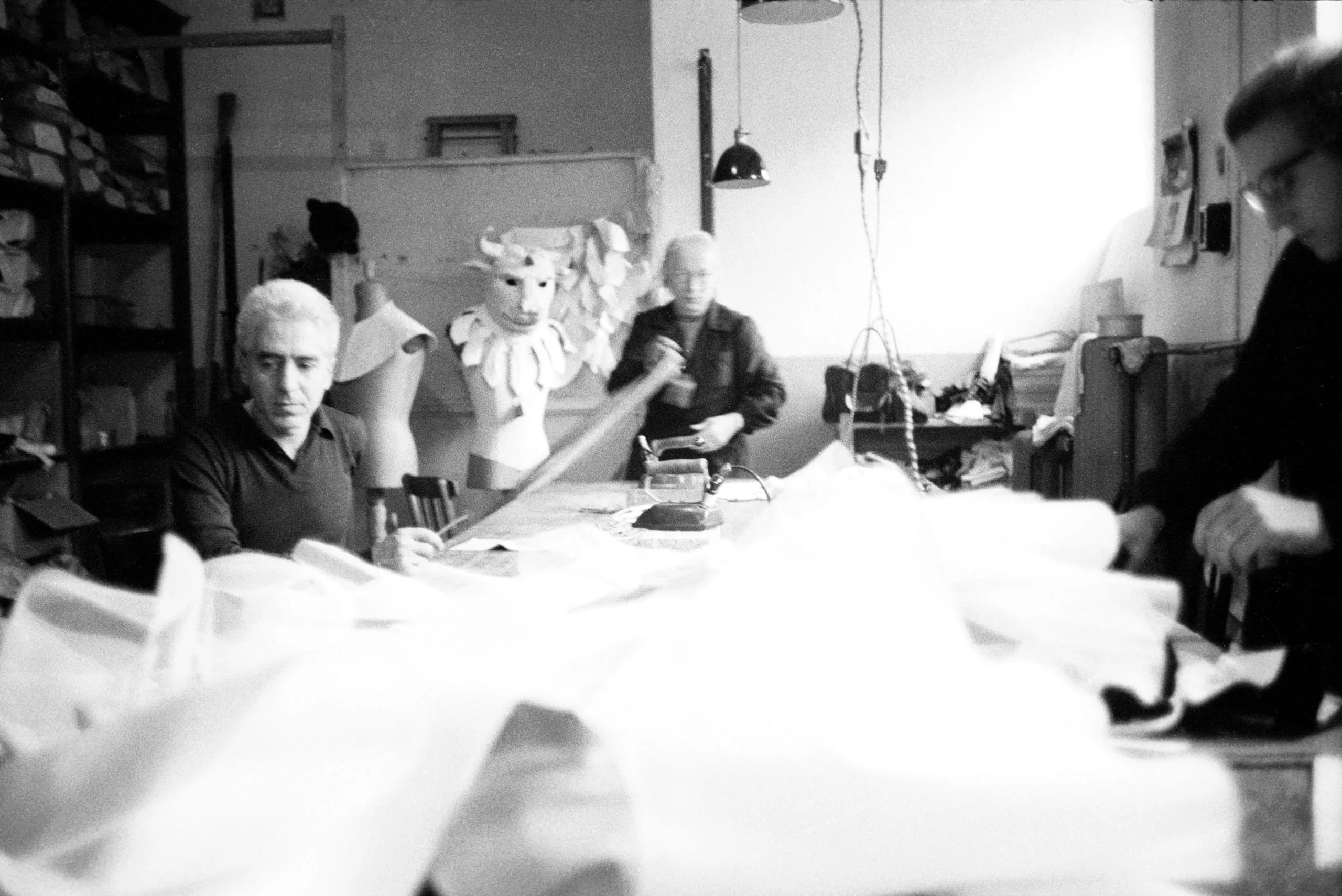 Black and white photograph of three men working in a costume or tailoring workshop, with white fabric draped across a long table and a theatrical animal-head costume on a dressmaker's mannequin in the background