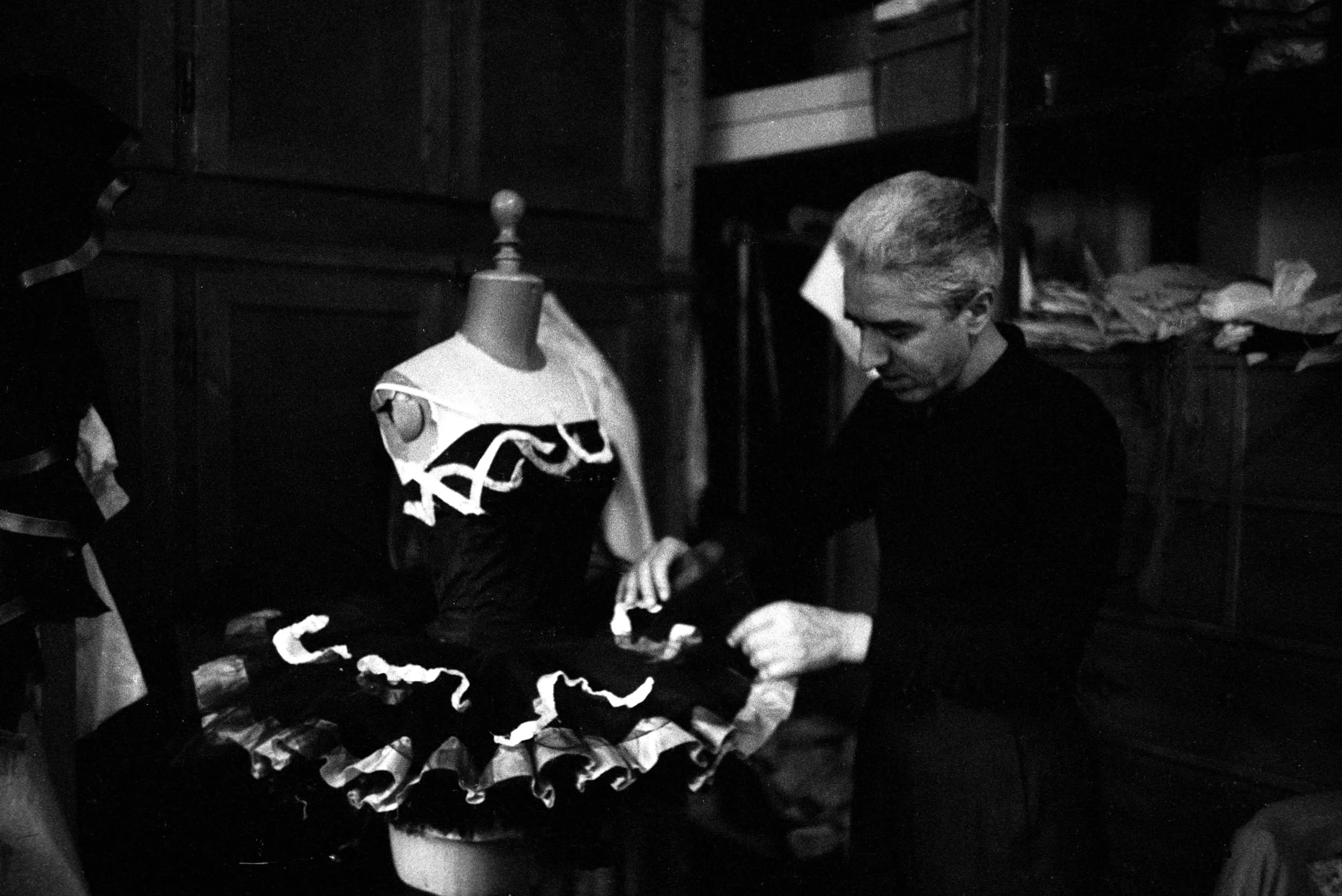 Black and white photograph of a man in a dark top adjusting a ruffled black and white garment on a dressmaker's mannequin in a dimly lit room