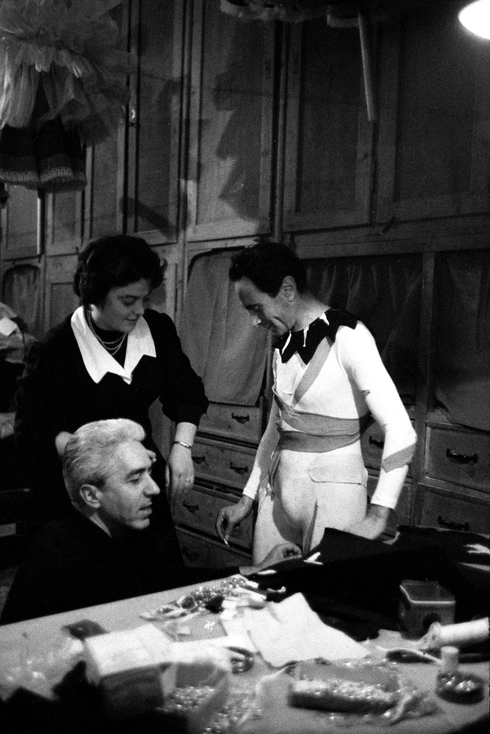 Black and white photograph of three people in a backstage room, one seated at a cluttered table, one standing in a theatrical white costume with a sash