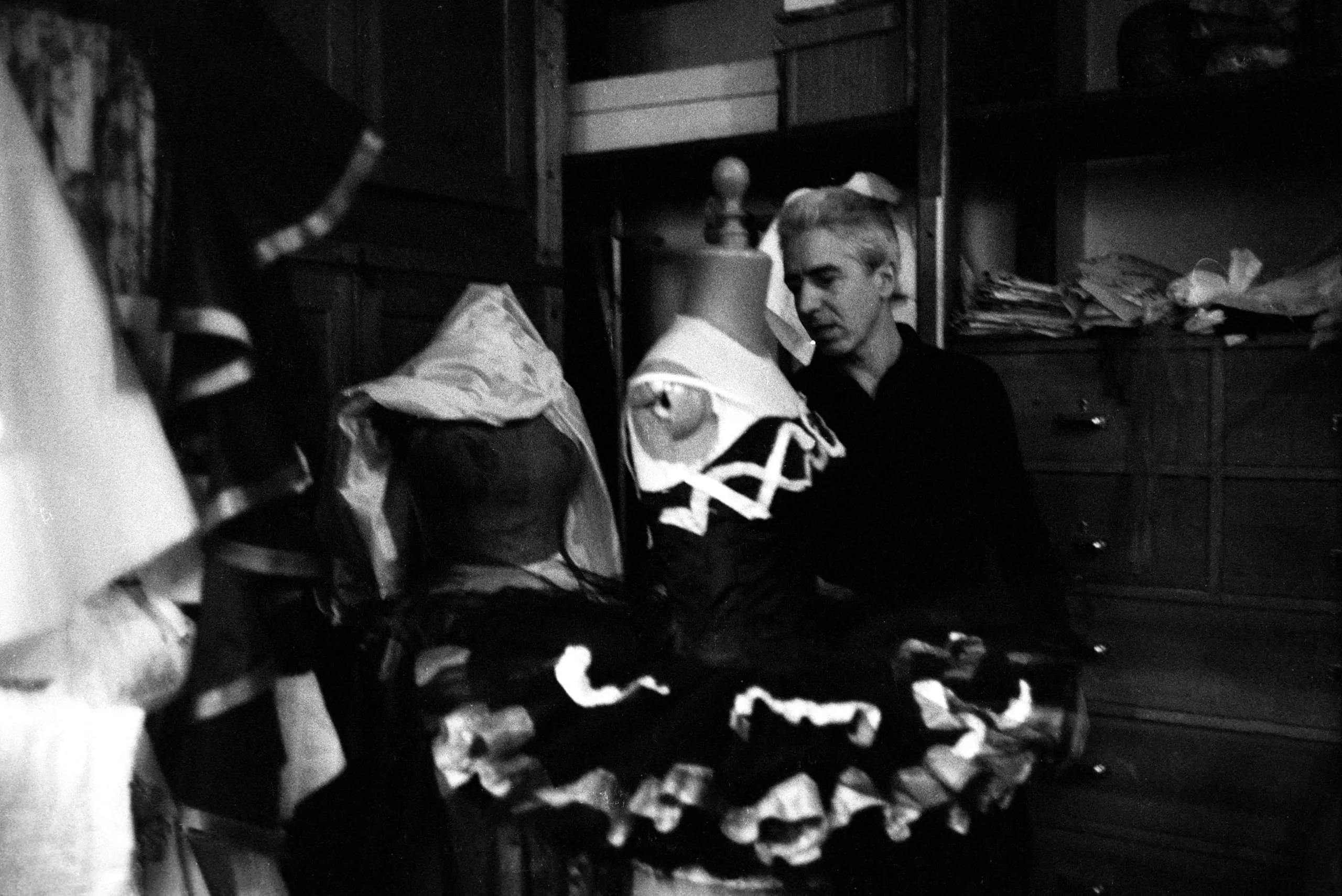 Black and white photograph of a man in a dark shirt standing behind two costumed dress forms in a dim workroom, with wooden shelving visible behind him